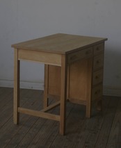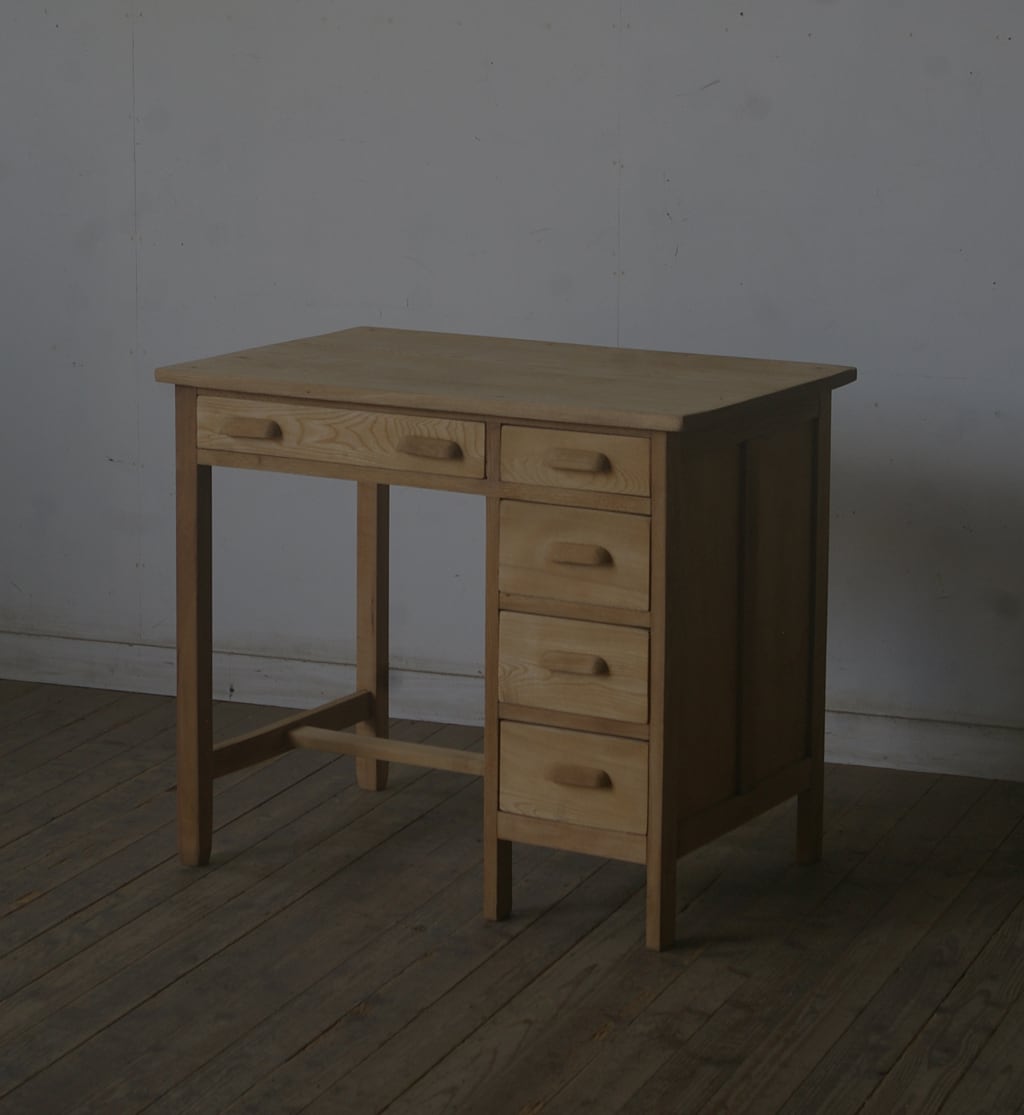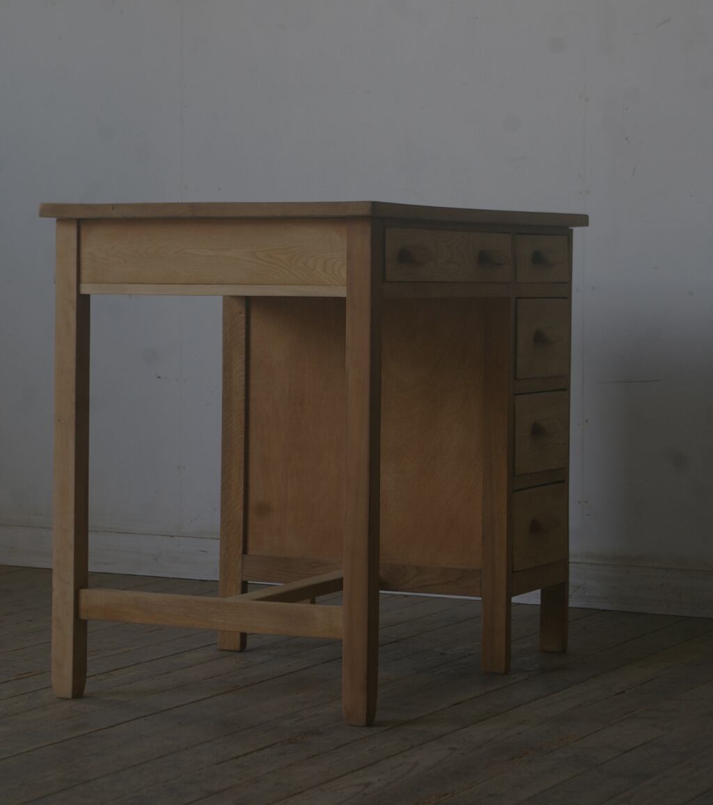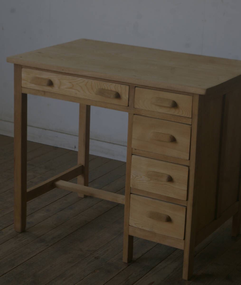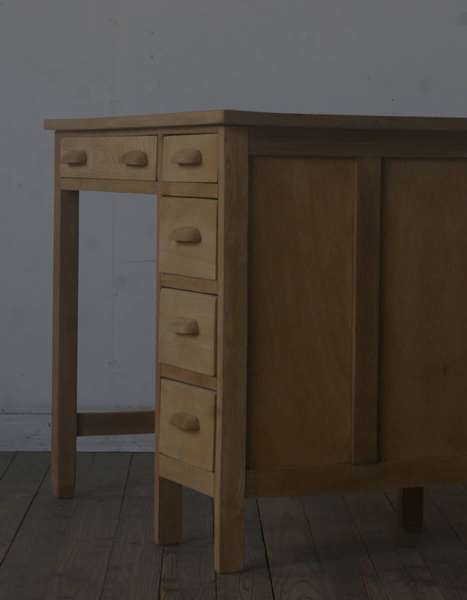 シンプルな造りでサイズ感も良く、ぼってりとした木製の引手と古い楢材の綺麗な木目がとても雰囲気の良いアンティーク片袖机です。