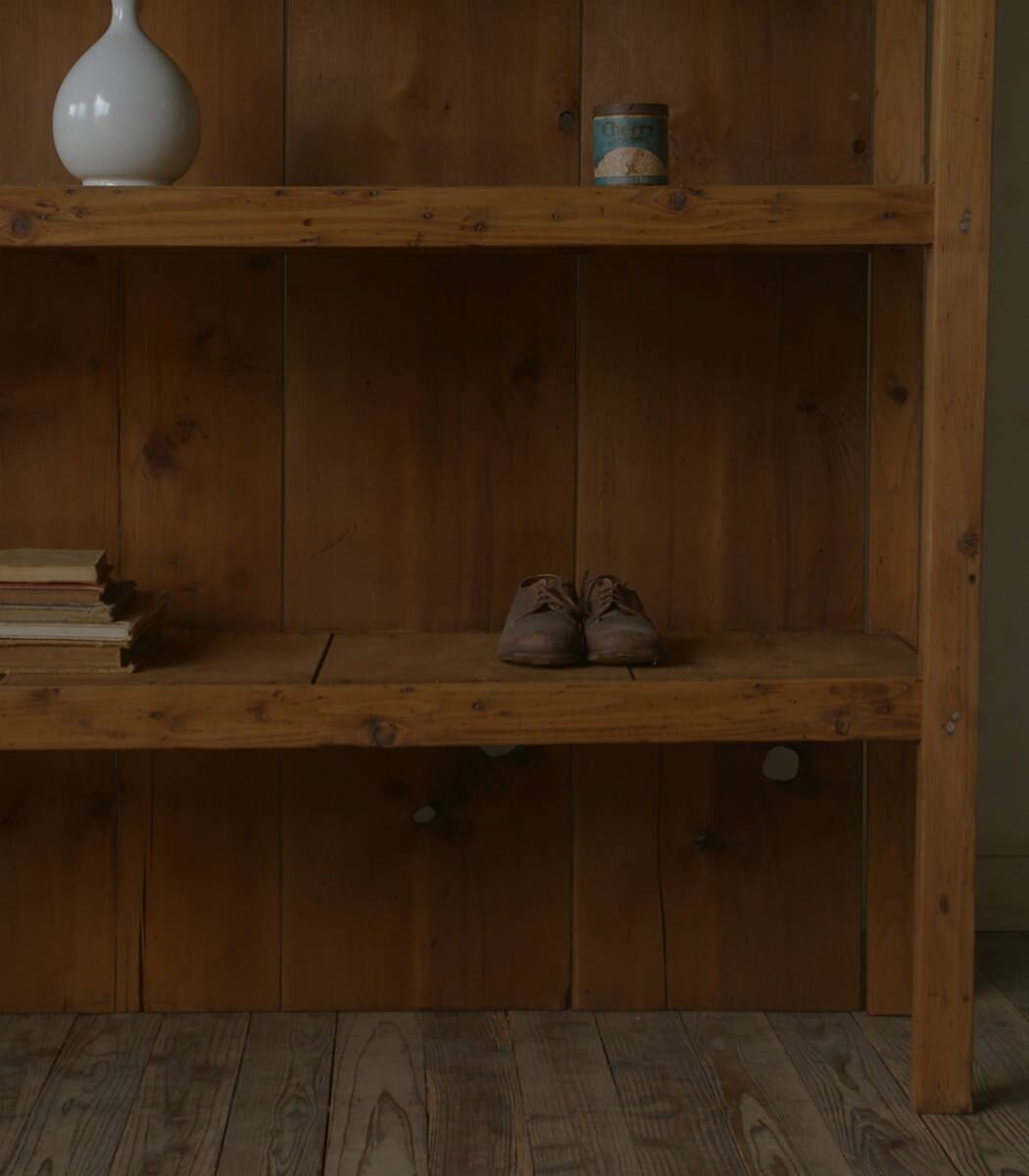 シンプルなグッドデザインで味があり、収納力もあり、とても存在感のあるアンティーク大きな飾り棚です。
