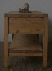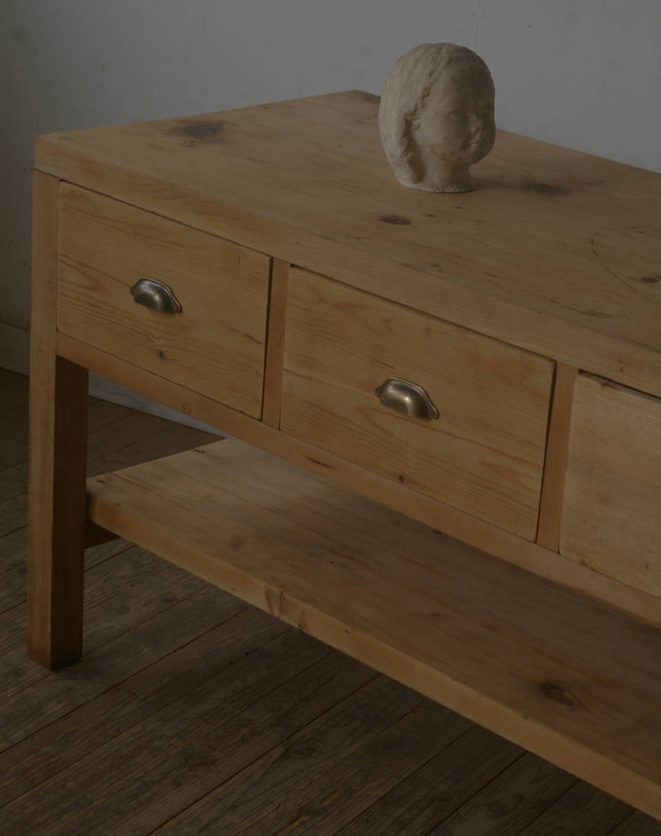 立派な造りで珍しく、重厚な厚い天板と太い脚、4杯の大きな引き出しと古い無垢材の綺麗な木目がとても雰囲気の良いアンティーク大きな横長展示台テーブルです。