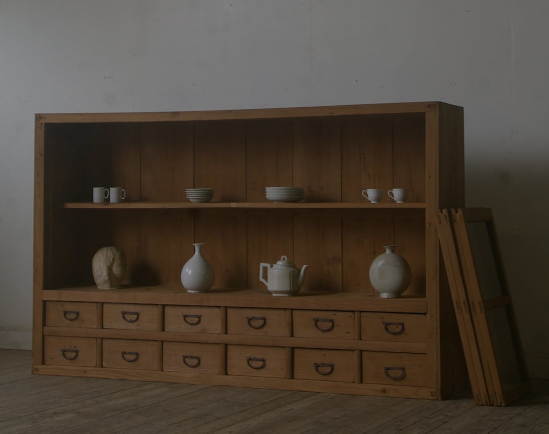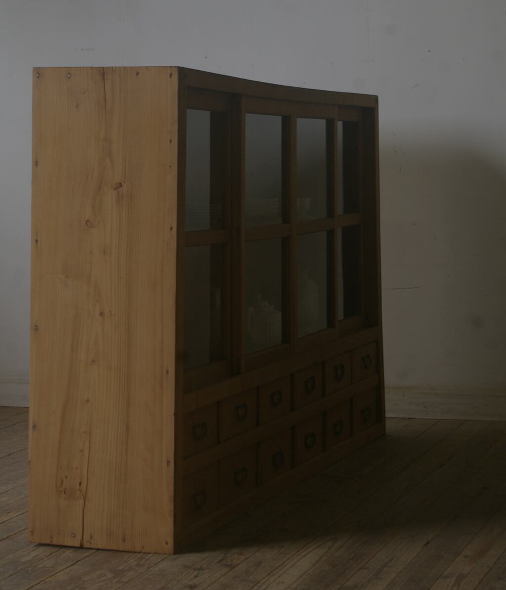 希少 引き出し12杯 古い横長4枚ガラス戸棚 YZ2249