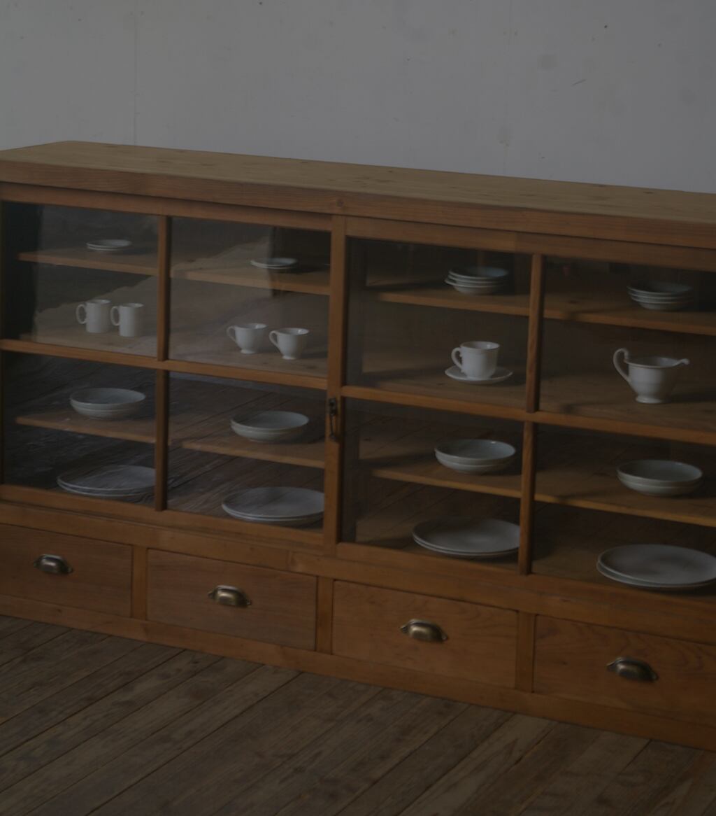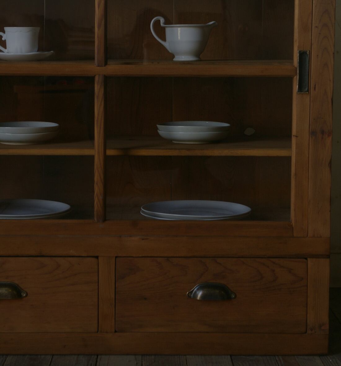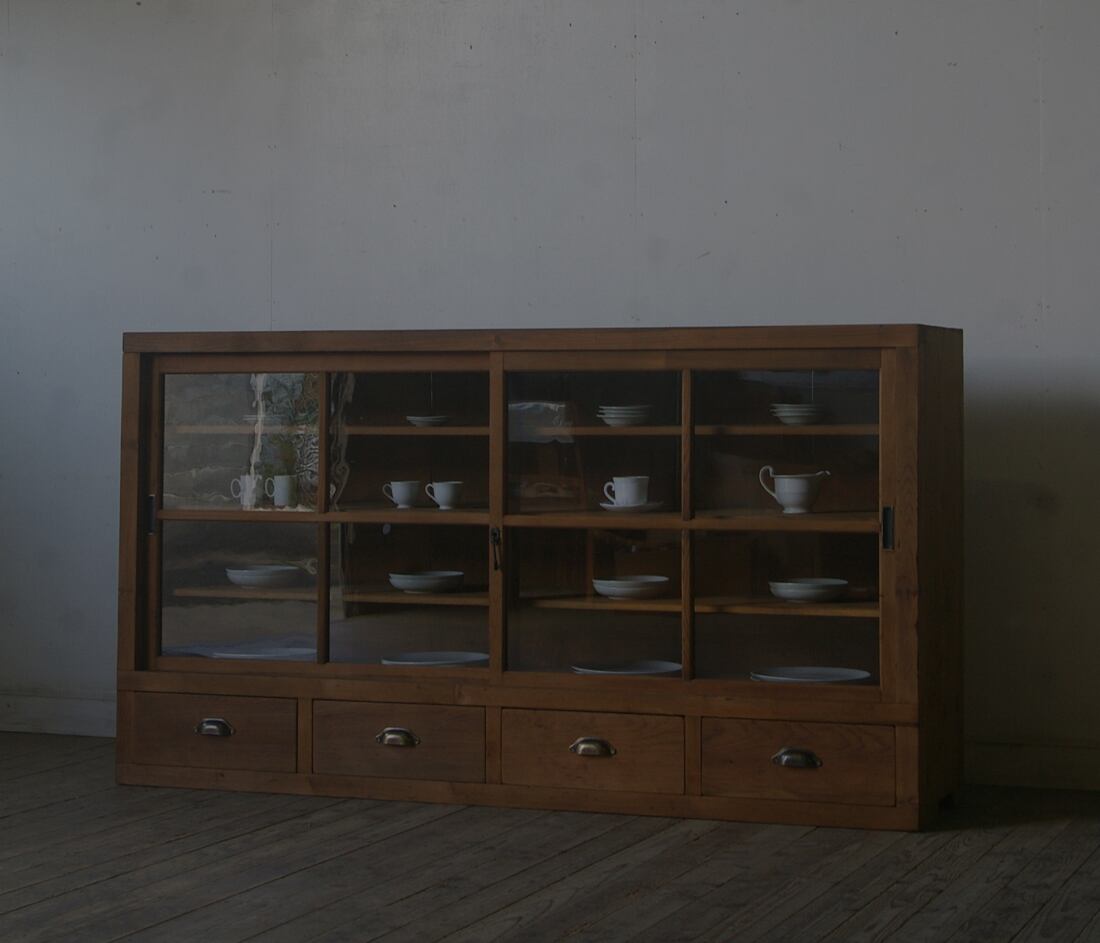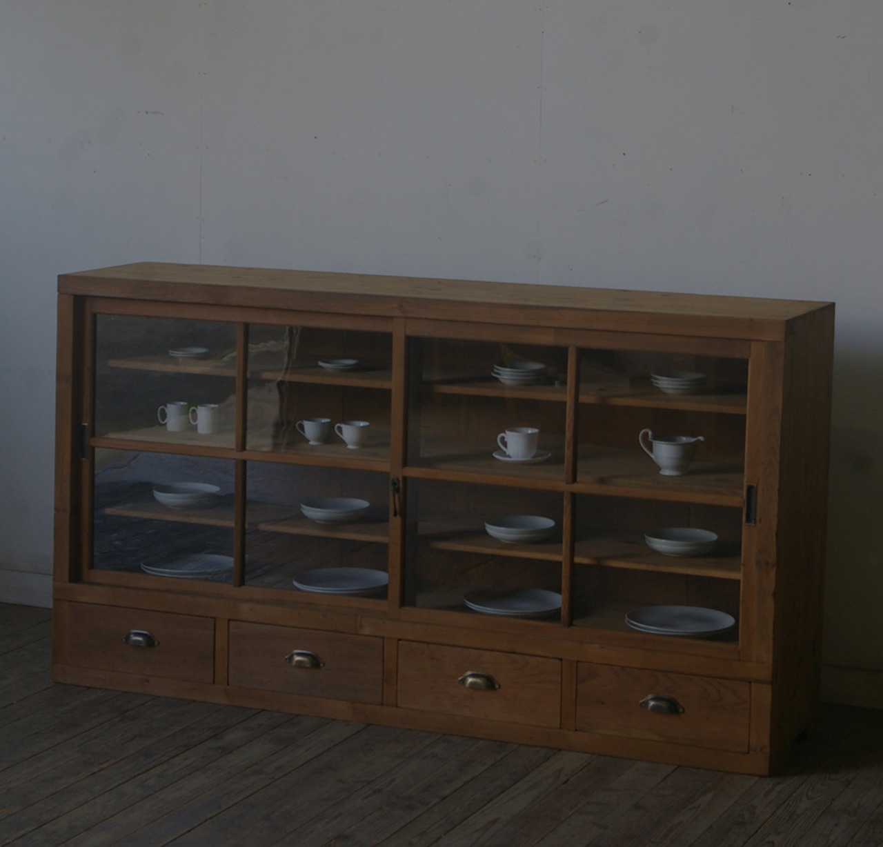 シンプルなグッドデザインで造りも良く、収納力もあり、大きな2枚の十字ガラス戸と4杯の引き出し、古い無垢材の綺麗な木目がとても雰囲気の良いアンティークガラス戸棚ですので、店舗やギャラリーでの什器としてやご自宅でのコレクションケースや食器棚、本棚などに。