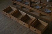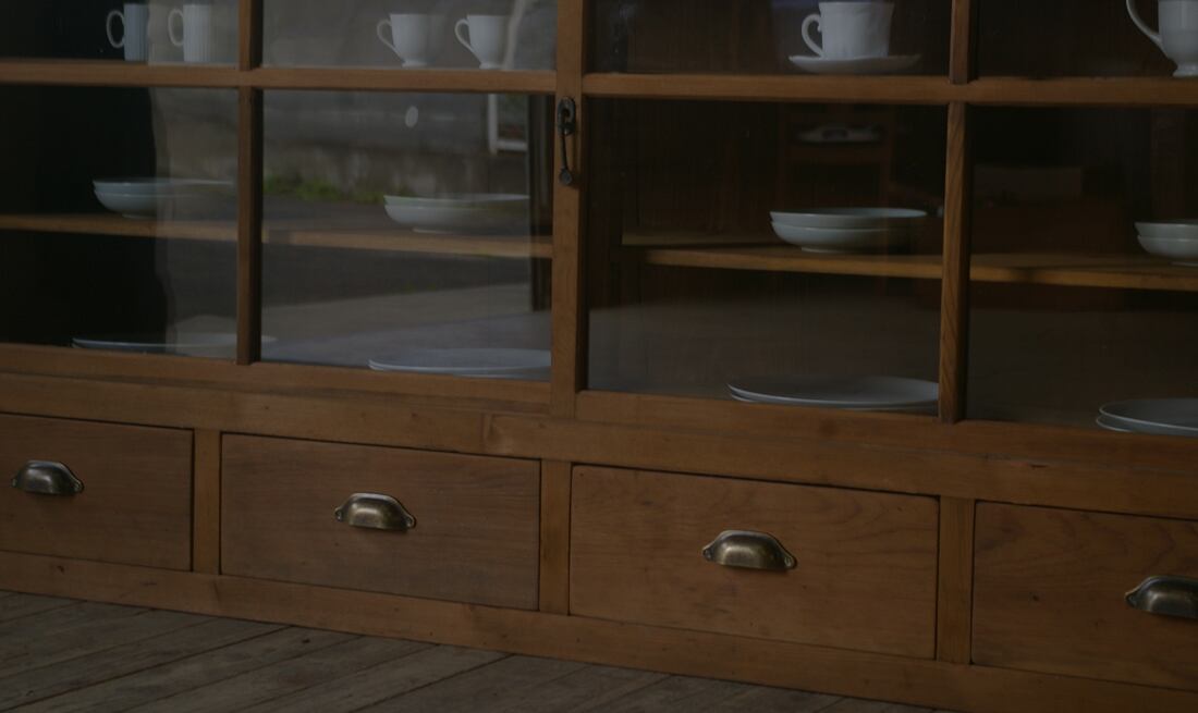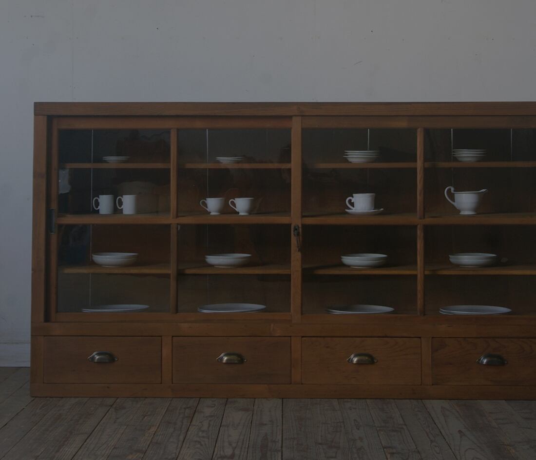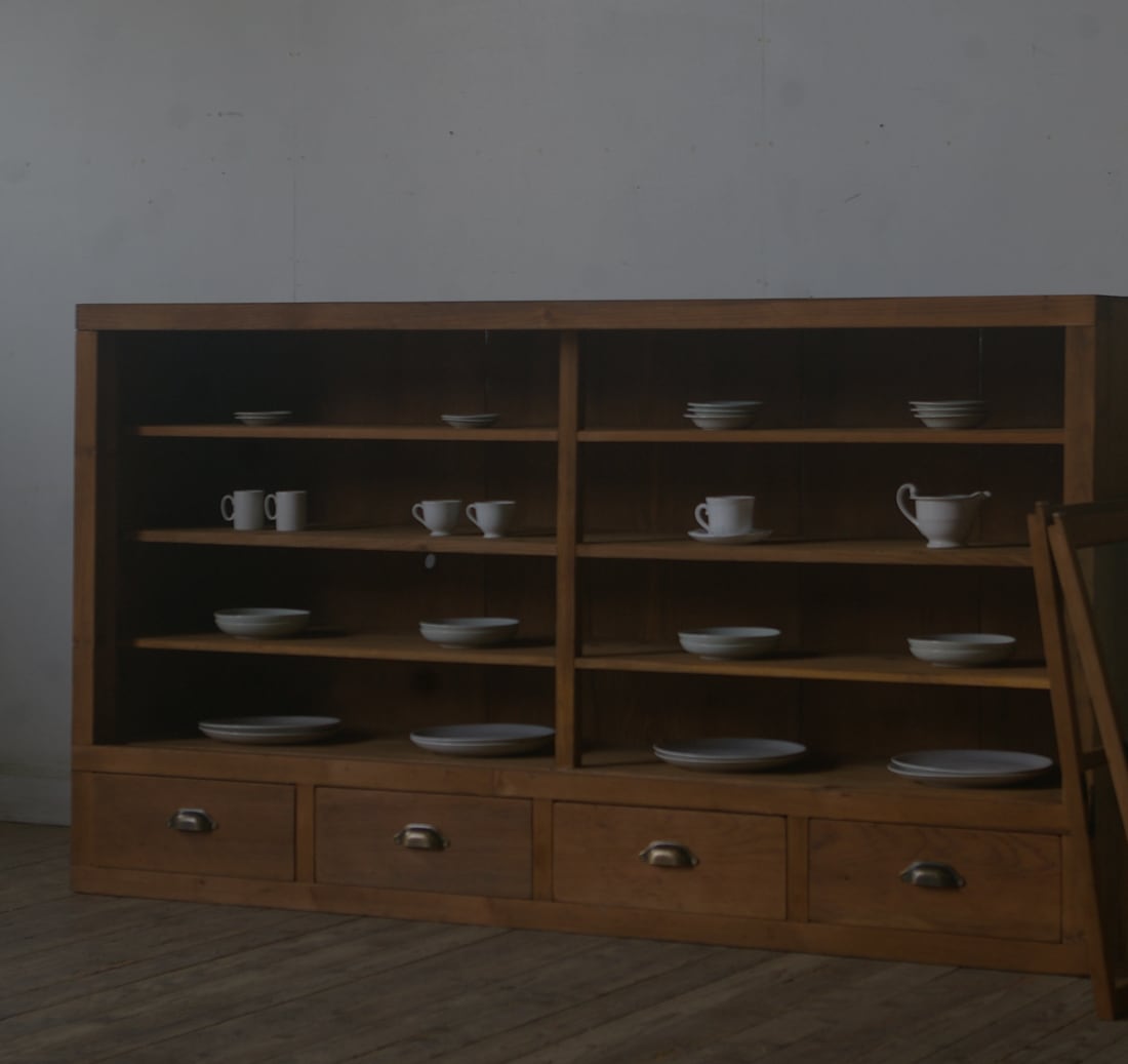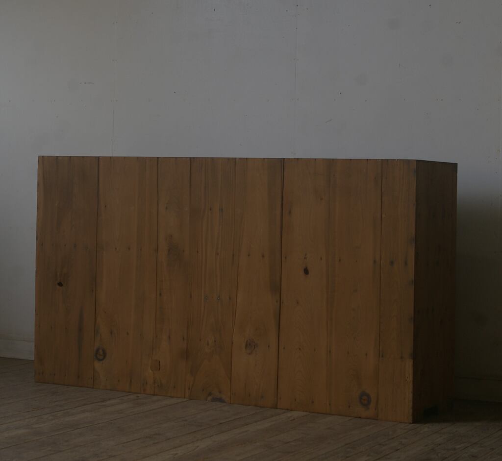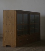 シンプルなグッドデザインで造りも良く、収納力もあり、大きな2枚の十字ガラス戸と4杯の引き出し、古い無垢材の綺麗な木目がとても雰囲気の良いアンティークガラス戸棚ですので、店舗やギャラリーでの什器としてやご自宅でのコレクションケースや食器棚、本棚などに。