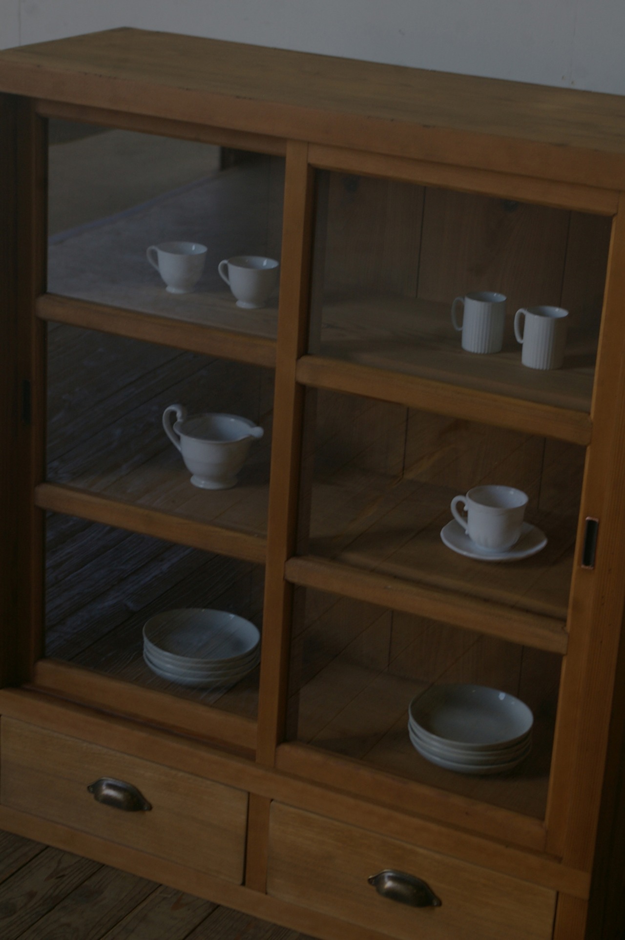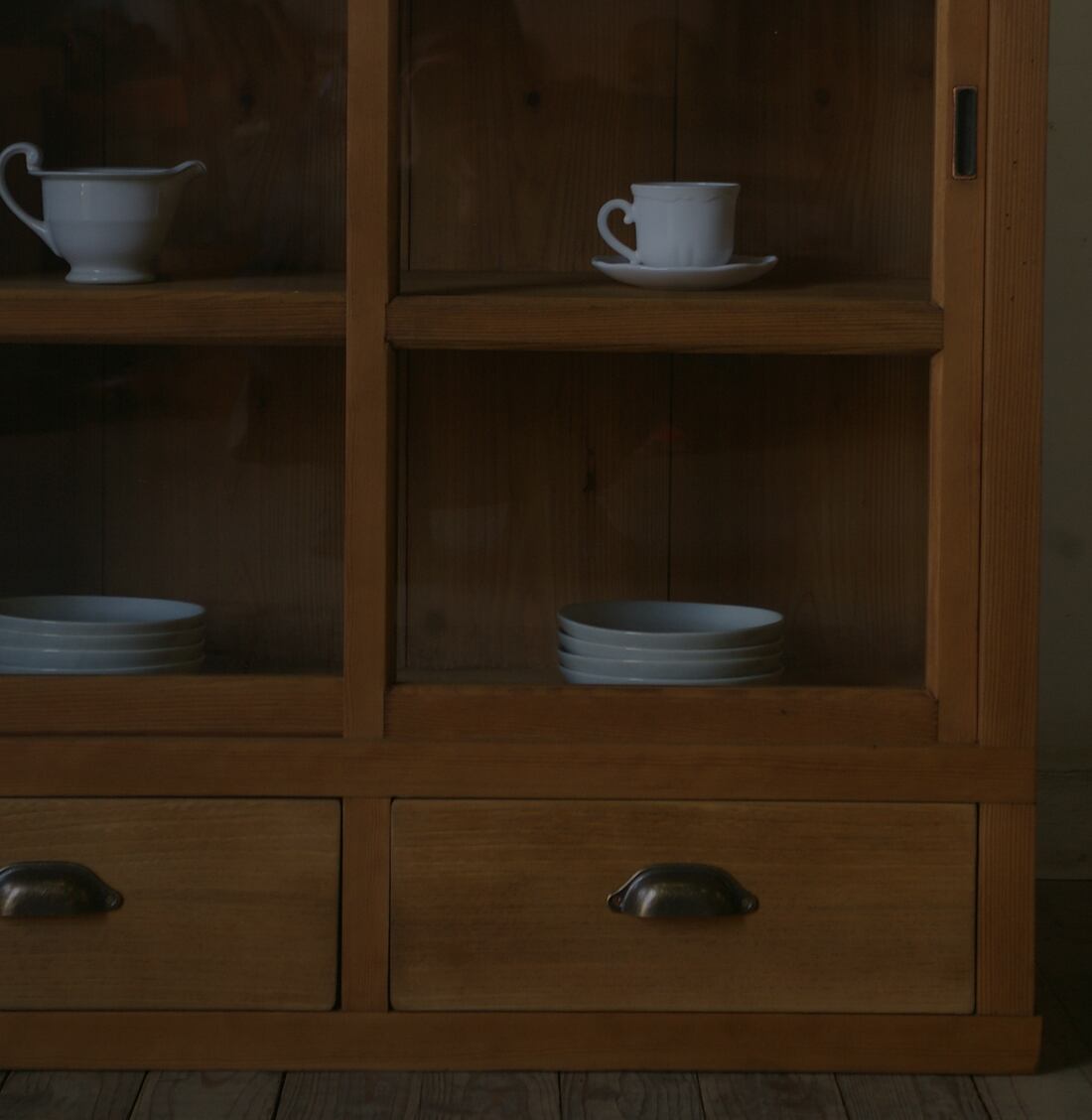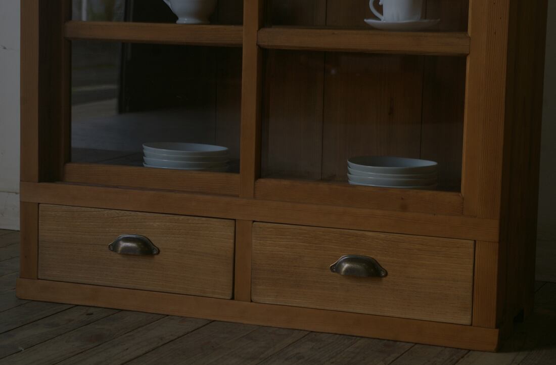 シンプルなグッドデザインで造りも良く、収納力もあり、大きな2枚のガラス戸と2杯の引き出し、古い無垢材の綺麗な木目がとても雰囲気の良いアンティークガラス戸棚ですので、店舗やギャラリーでの什器としてやご自宅でのコレクションケースや食器棚、本棚などに。