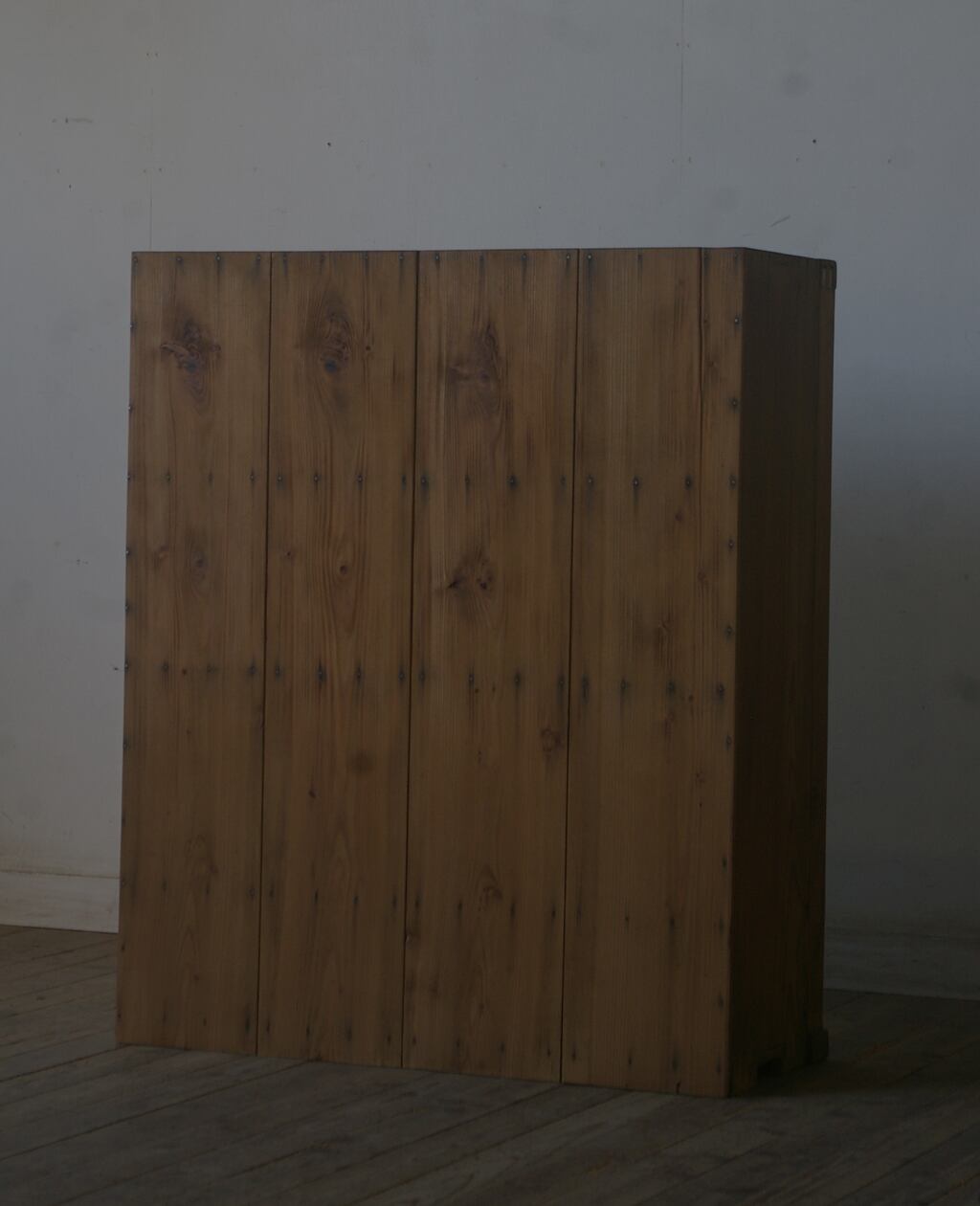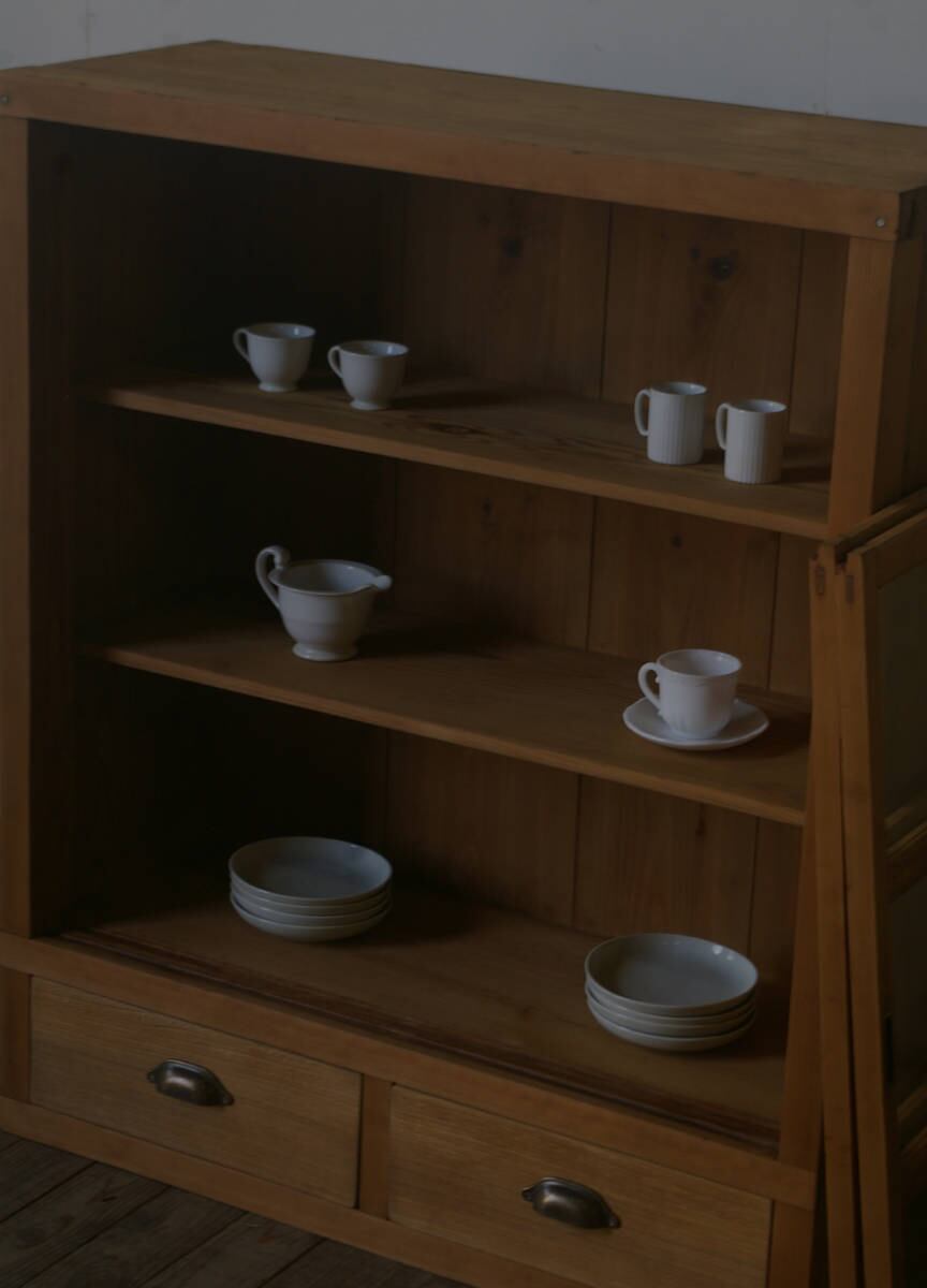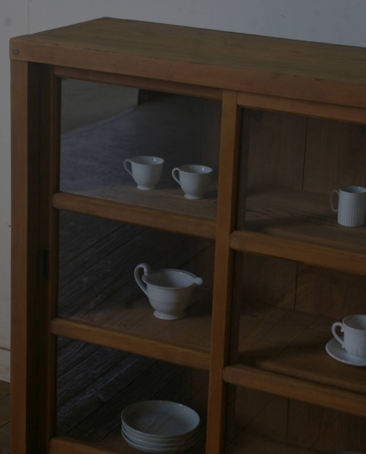 シンプルなグッドデザインで造りも良く、収納力もあり、大きな2枚のガラス戸と2杯の引き出し、古い無垢材の綺麗な木目がとても雰囲気の良いアンティークガラス戸棚ですので、店舗やギャラリーでの什器としてやご自宅でのコレクションケースや食器棚、本棚などに。