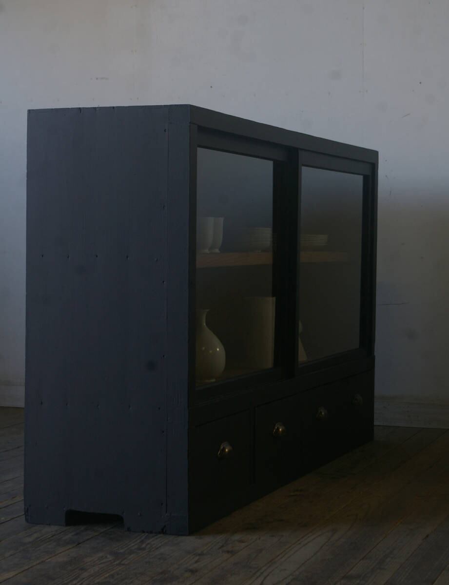 引き出し4杯 古い横長ガラス戸棚 食器棚 YZ2261