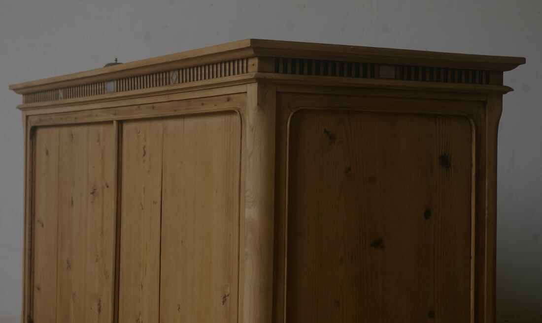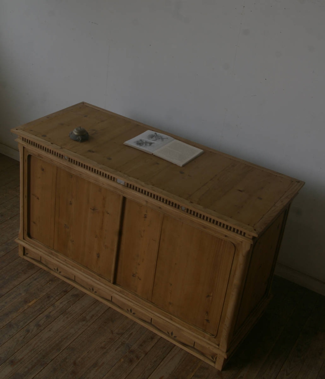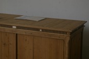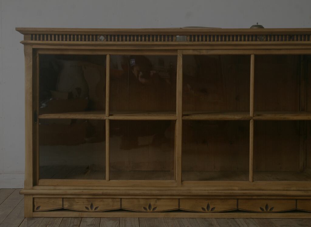 立派な造りで珍しく、存在感があり、細部の細かい飾り模様や大きな2枚の十字ガラス戸、古い無垢材の綺麗な木目がとても雰囲気の良いアンティークカウンターになります。