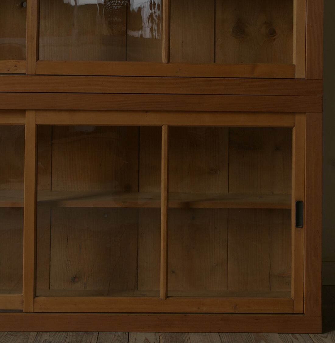 大きな4枚のガラス戸と重厚な古い無垢材の綺麗な木目がとても雰囲気の良いアンティーク重ね大きなガラス戸棚です。