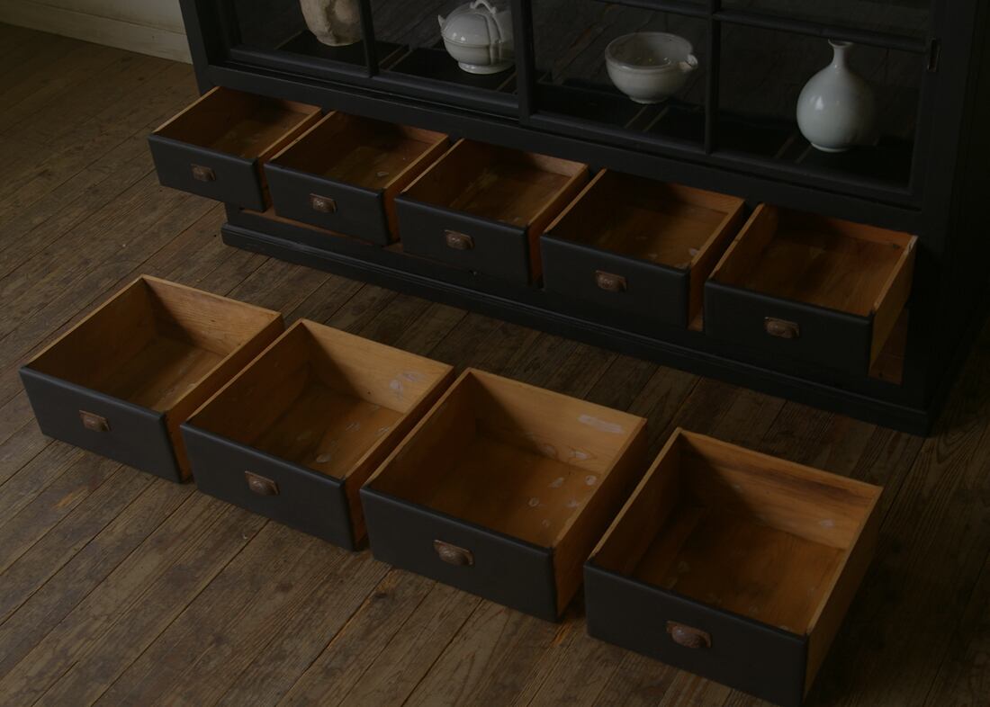 立派な造りでデザインも珍しく、とても存在感のあるアンティーク引き出し9杯重ね十字ガラス戸棚です。