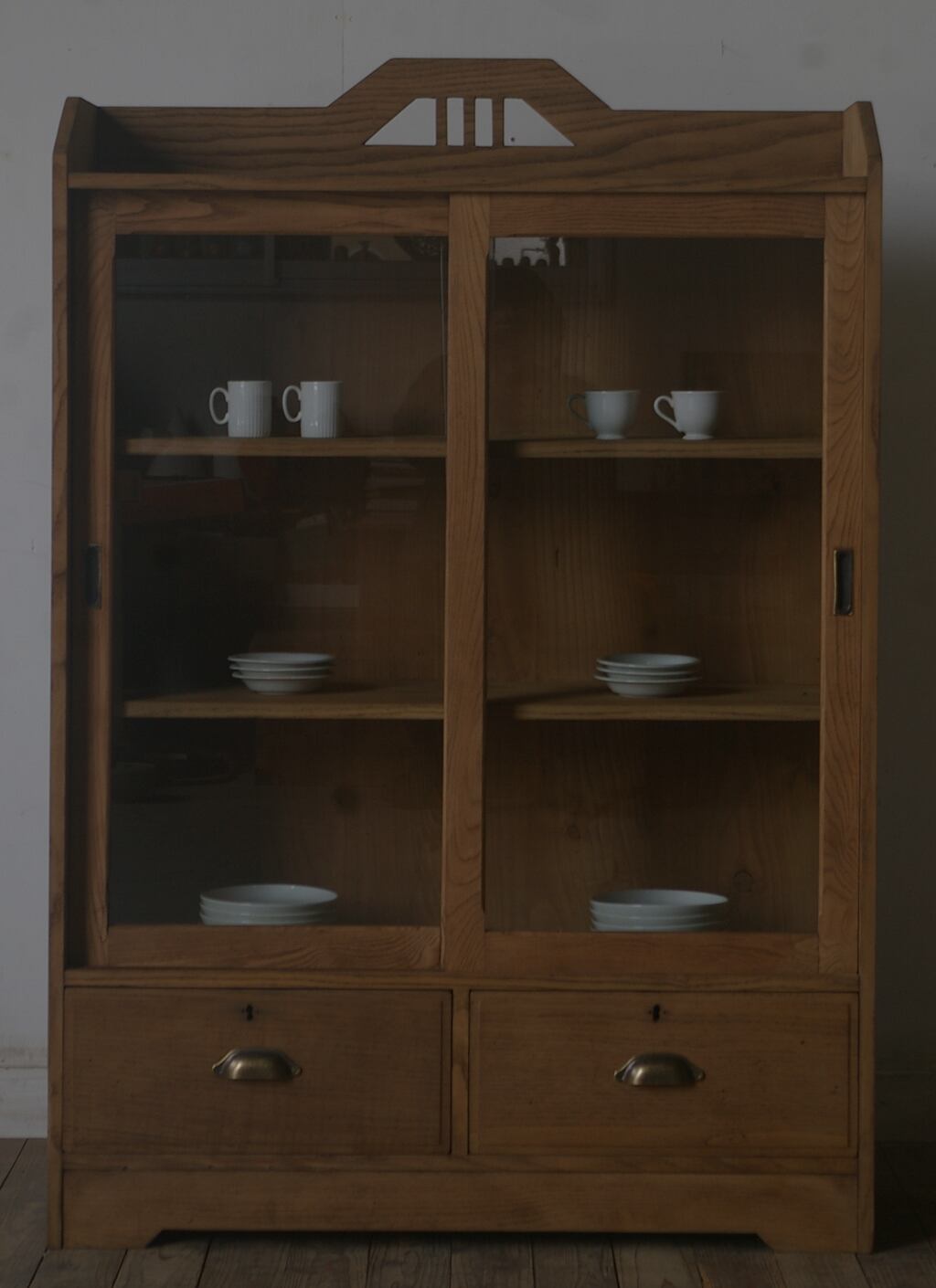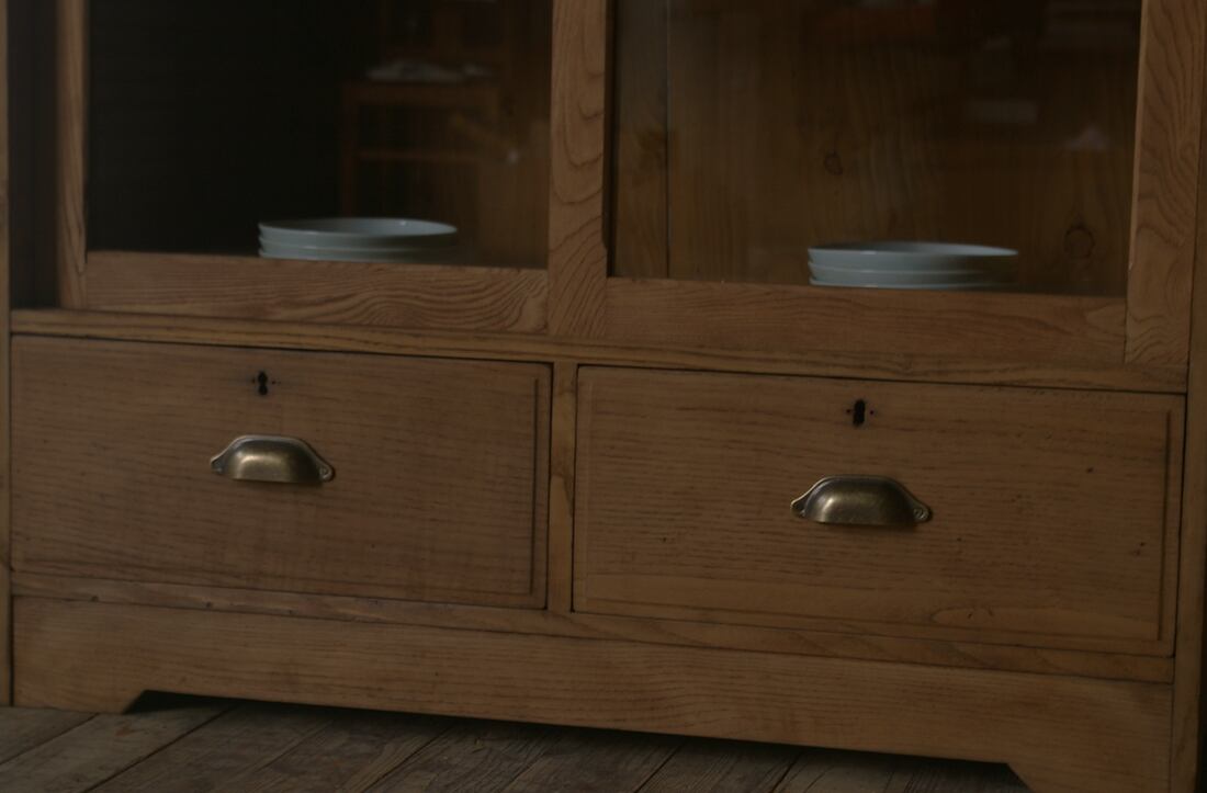 立派な造りでデザインも良く、大きな2枚のガラス戸と2杯の引き出し、重厚な古い楢材の綺麗な木目がとても雰囲気の良いアンティークガラス戸棚です。