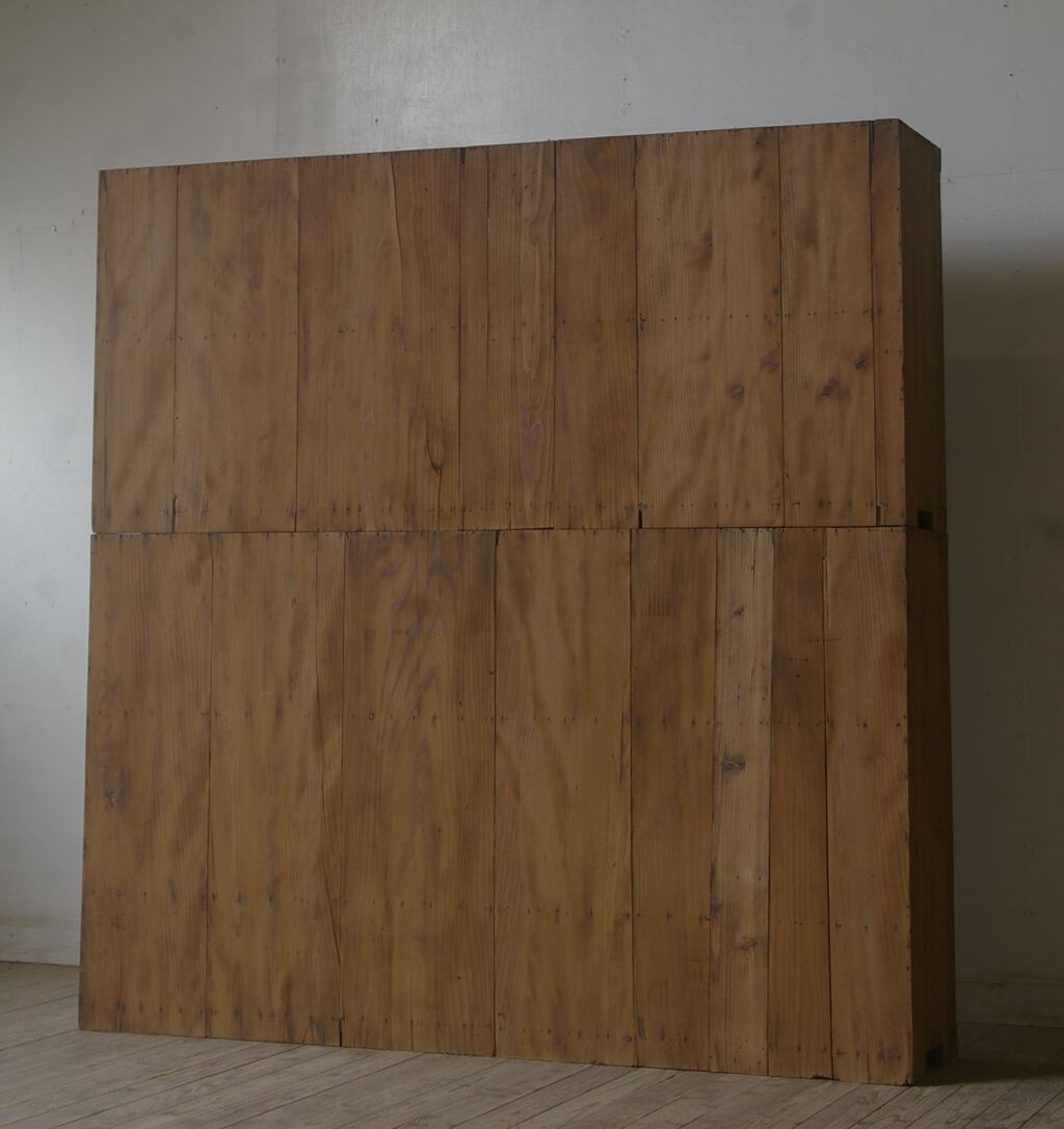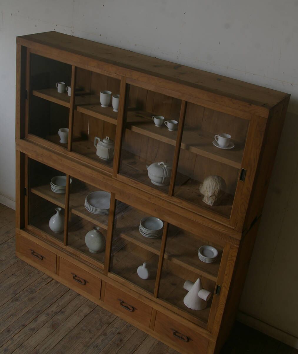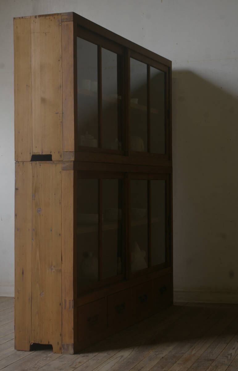 薄型のシンプルなデザインで造りも良く収納力もあり、古い無垢材の綺麗な木目がとても雰囲気の良いアンティーク重ね大きなガラス戸棚です。