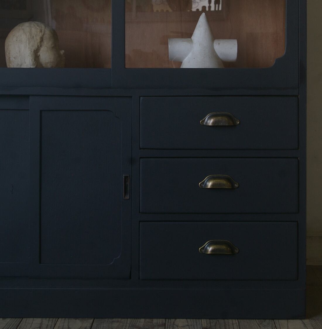 シンプルな縦型のグッドデザインで造りも良く、収納力もあり、とても存在感のあるアンティークキャビネットです。