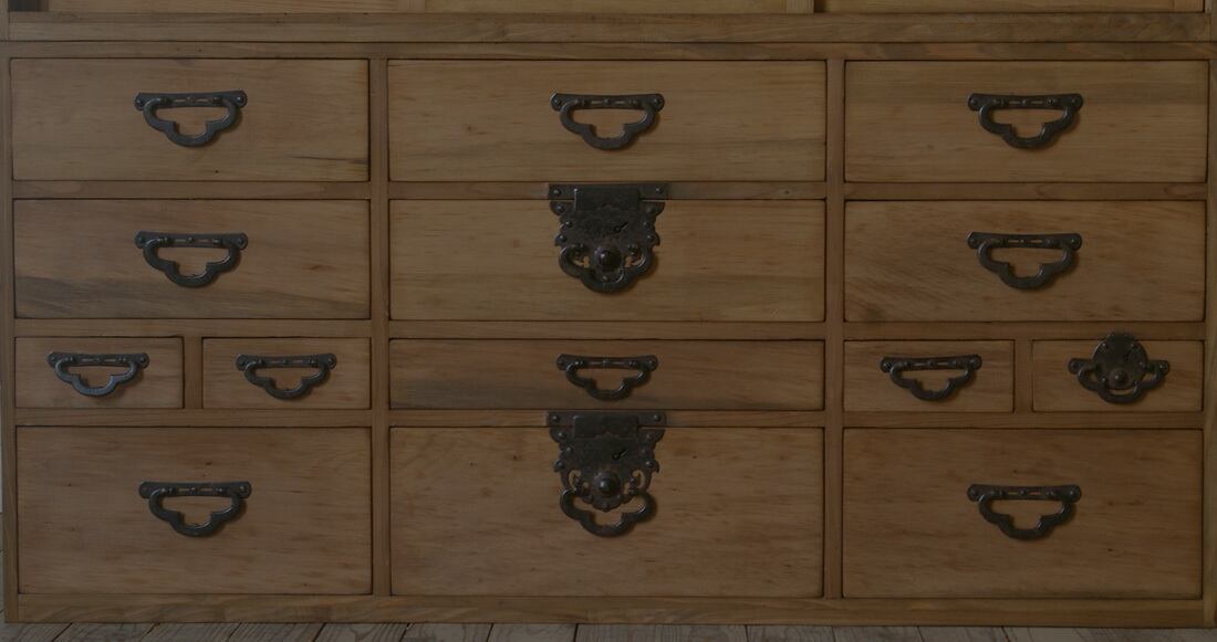 引き出し14杯3枚戸重ねガラス戸棚 YZ2324