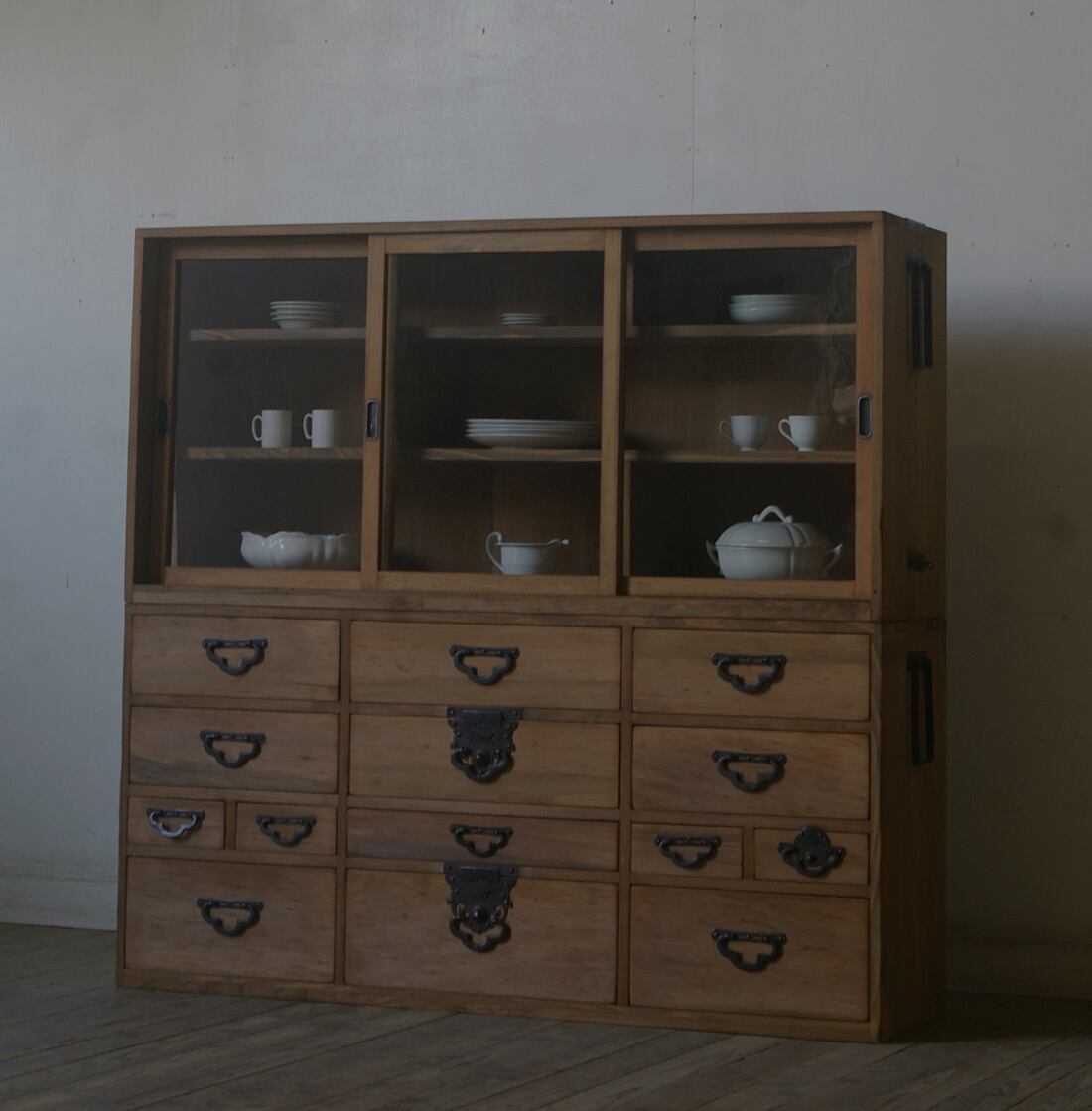 珍しいデザインで造りも良く、古い無垢材の綺麗な木目がとても雰囲気の良いアンティーク重ねガラス戸棚の道具箪笥です。