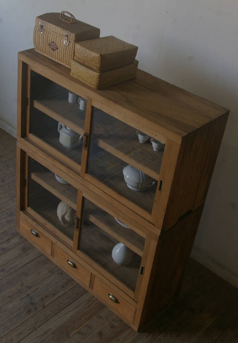 引き出し3杯◆古い重ねガラス戸棚 YZ2331