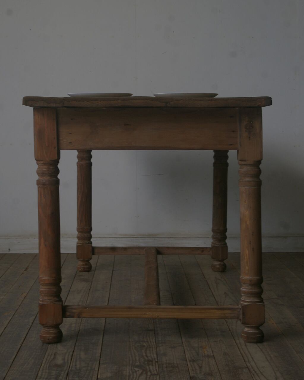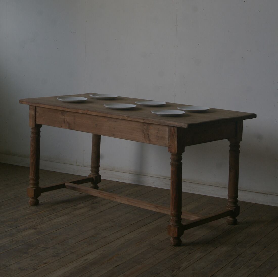 シンプルなデザインで造りも良く、重厚な厚い天板と太い脚、古い無垢材の綺麗な木目がとても雰囲気の良いアンティークダイニングテーブルです。