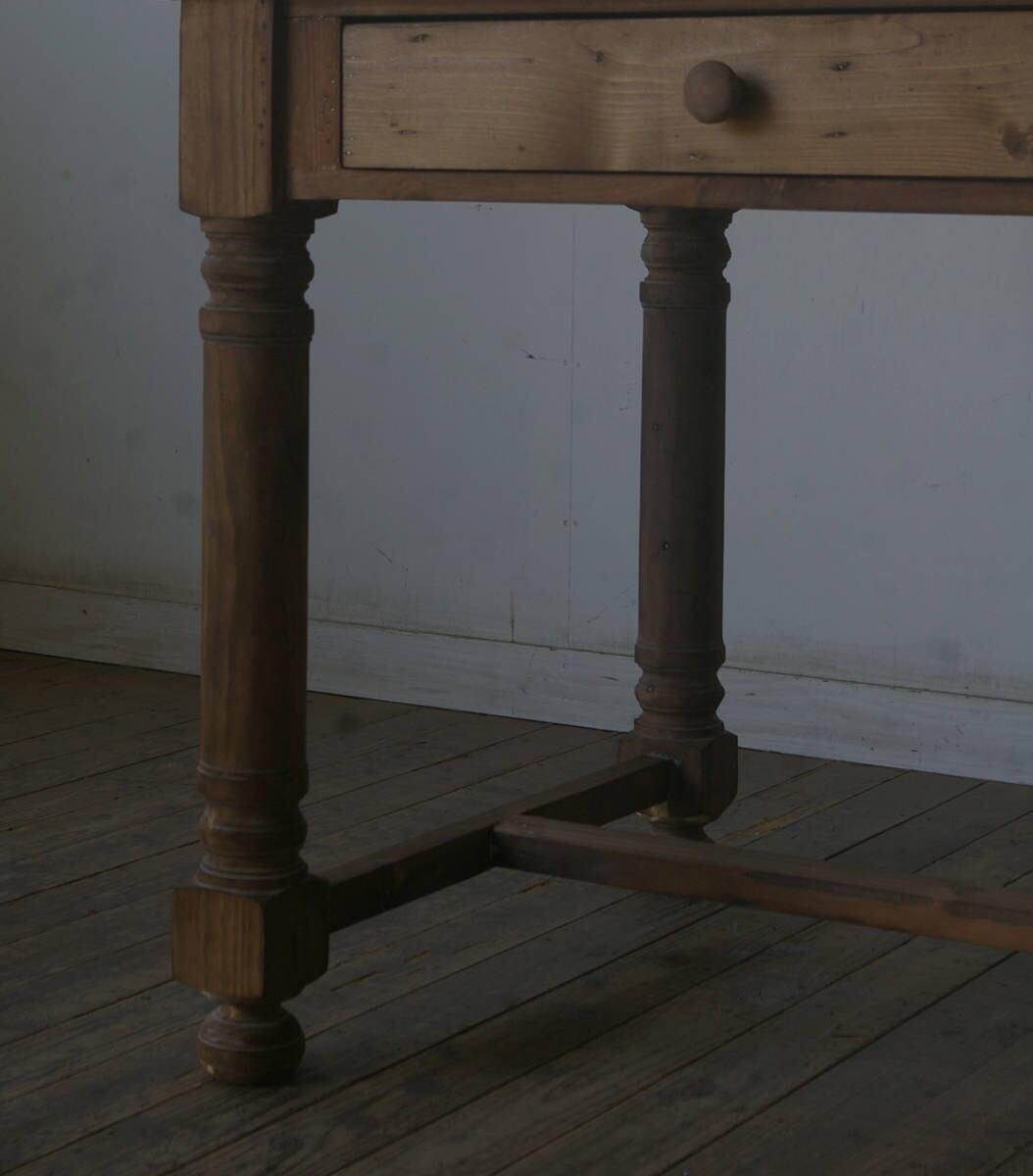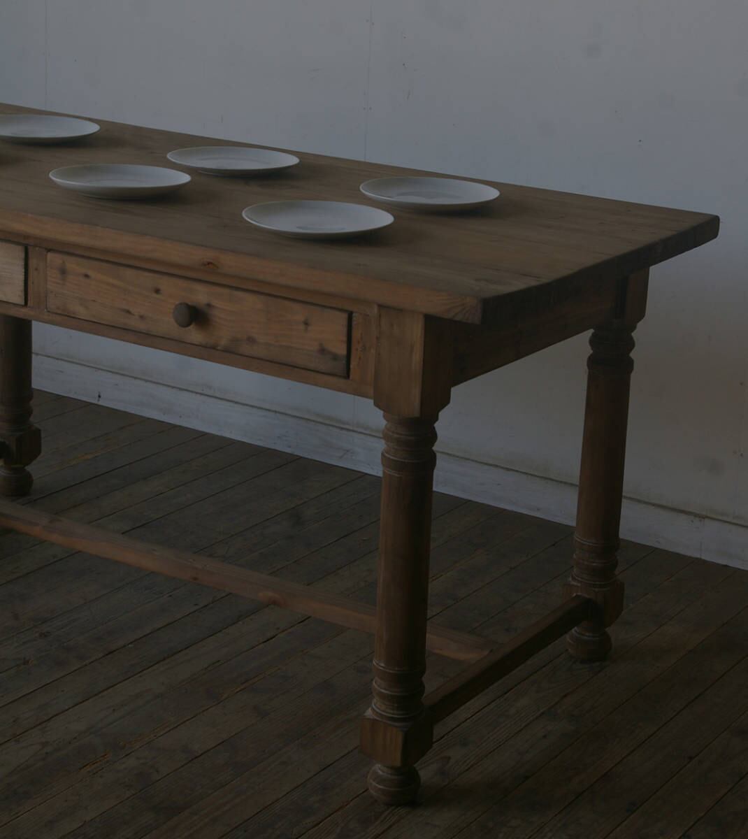 シンプルなデザインで造りも良く、重厚な厚い天板と太い脚、古い無垢材の綺麗な木目がとても雰囲気の良いアンティークダイニングテーブルです。