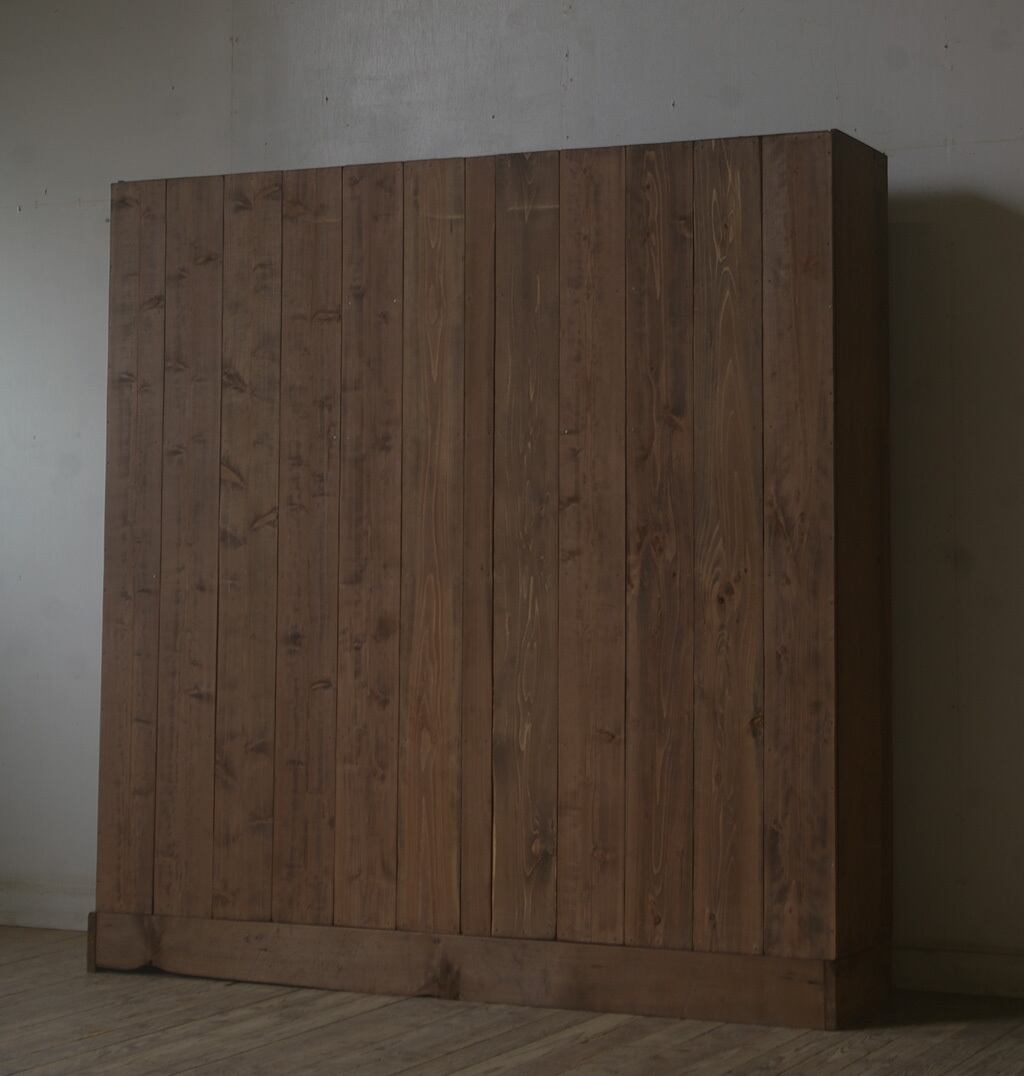 シンプルな造りも良く収納力もあり、大きな4枚のガラス戸と古い無垢材の綺麗な木目がとても雰囲気の良いアンティーク重ねガラス戸棚です。