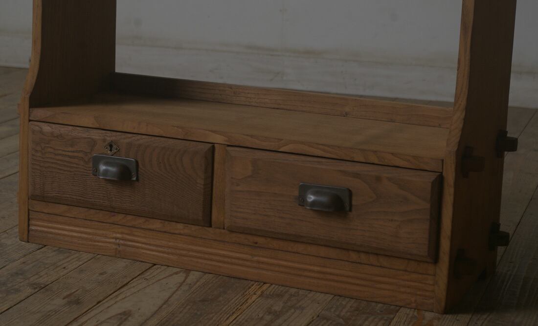 シンプルなグッドデザインで造りも良く、2杯の引き出しと古い楢材の綺麗な木目がとても雰囲気の良いアンティーク本棚です。