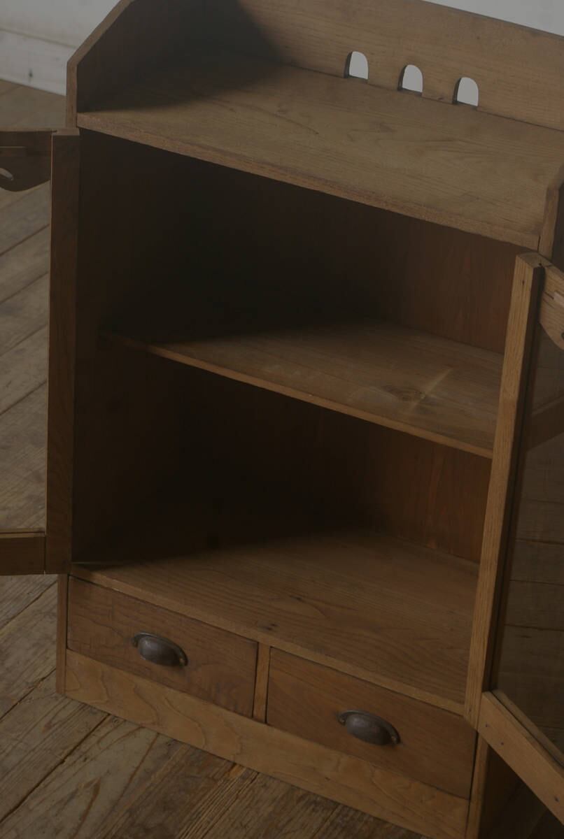 グッドデザインで造りも良く、古い楢材の綺麗な木目がとても雰囲気の良いアンティークガラス扉飾り棚です。