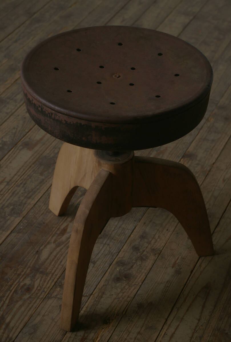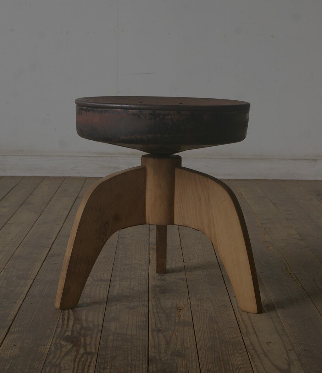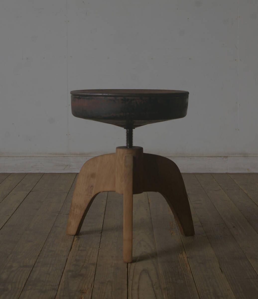 古い鉄の座面と木脚の組み合わせがとても雰囲気の良いアンティーク回転丸スツールです。