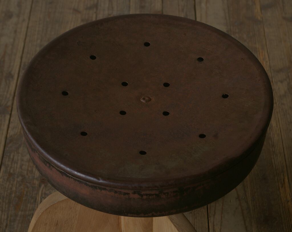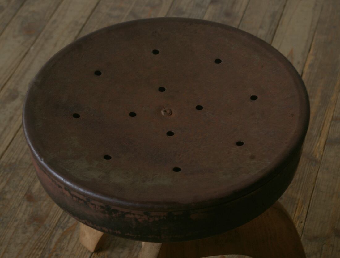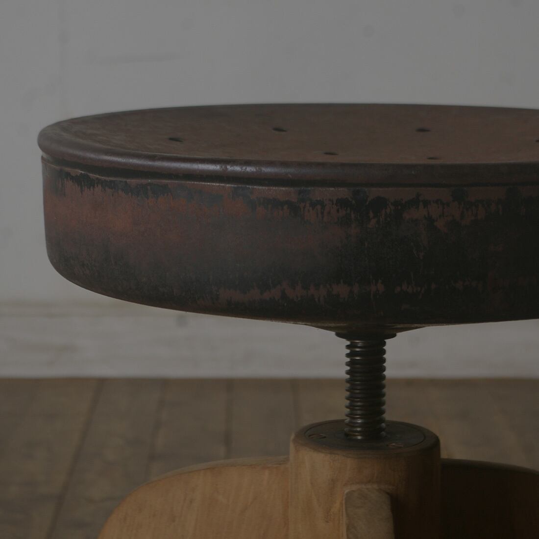 古い鉄の座面と木脚の組み合わせがとても雰囲気の良いアンティーク回転丸スツールです。