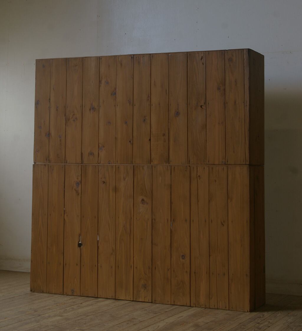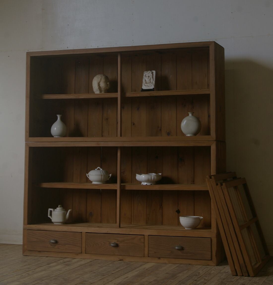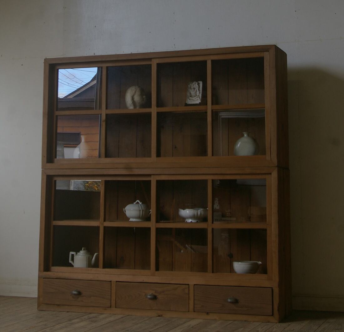 大きな4枚のガラス戸と3杯の引き出し古い無垢材の綺麗な木目がとても雰囲気の良いアンティーク重ね大きなガラス戸棚です。