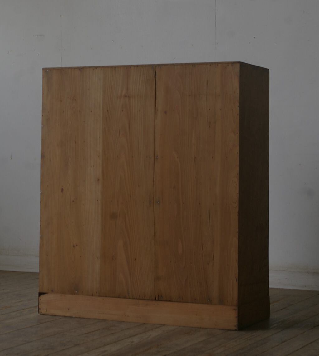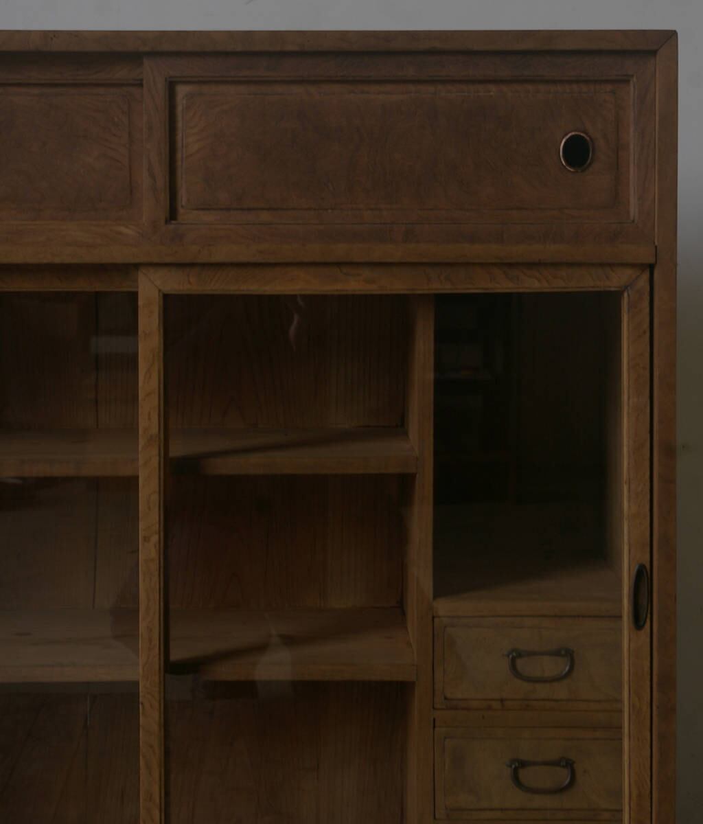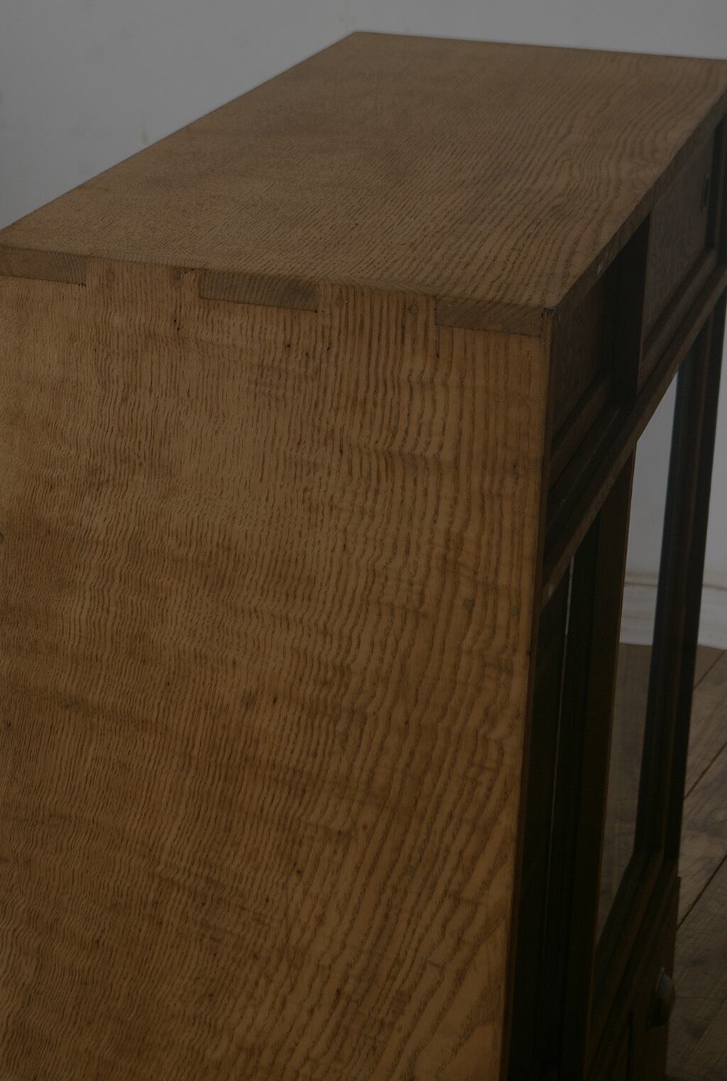 立派な造りでサイズ感も良く、収納力もあり、古い無垢材の綺麗な木目がとても雰囲気の良いアンティークガラス戸棚です。