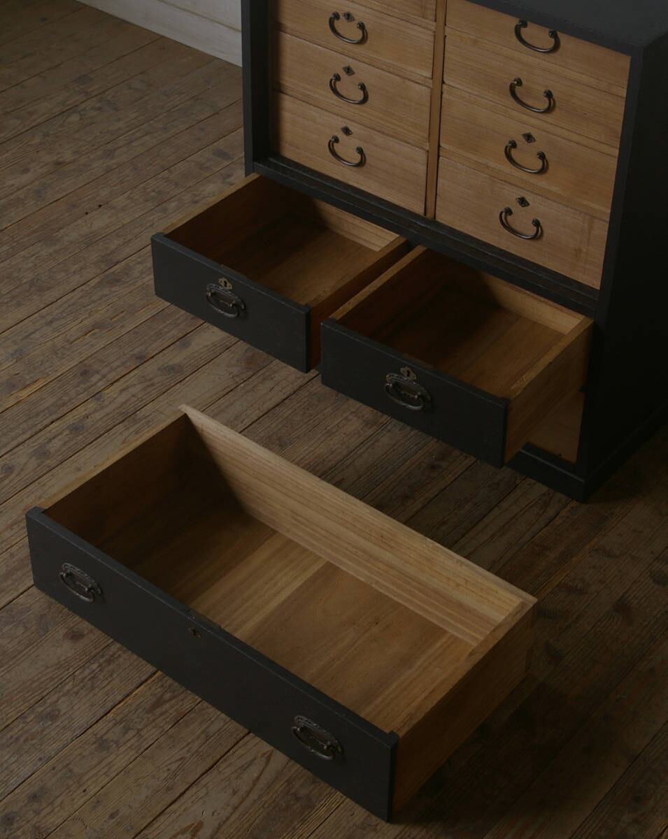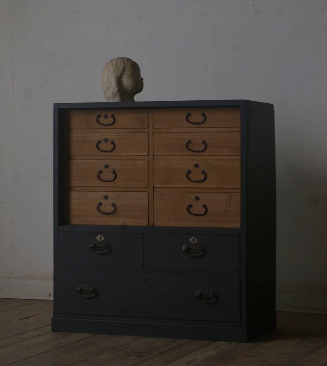 古い物ですので細かい傷や汚れはございます。引き出しの開閉は問題ございません。シンプルなグッドデザインで収納力もあり、とても存在感のあるアンティークチェストですので、店舗やギャラリーでの什器としてやご自宅での本棚や書庫、パーツケースや展示台などに
