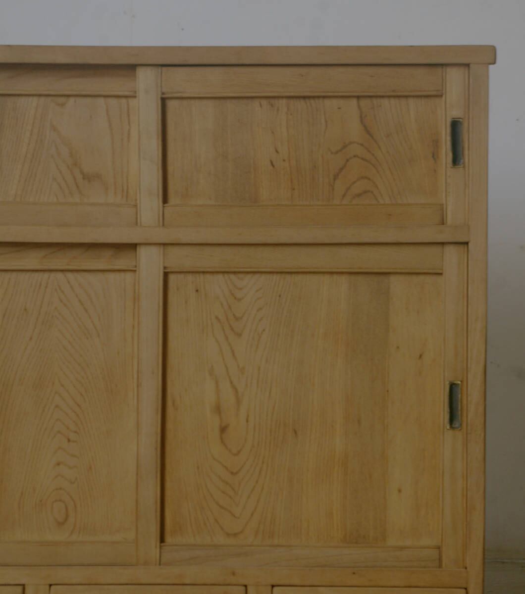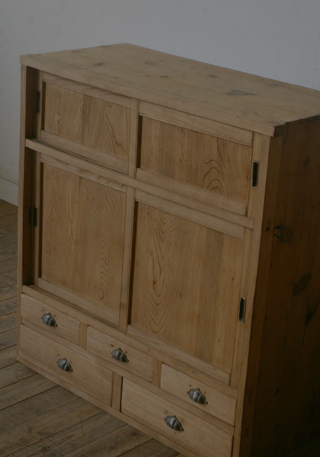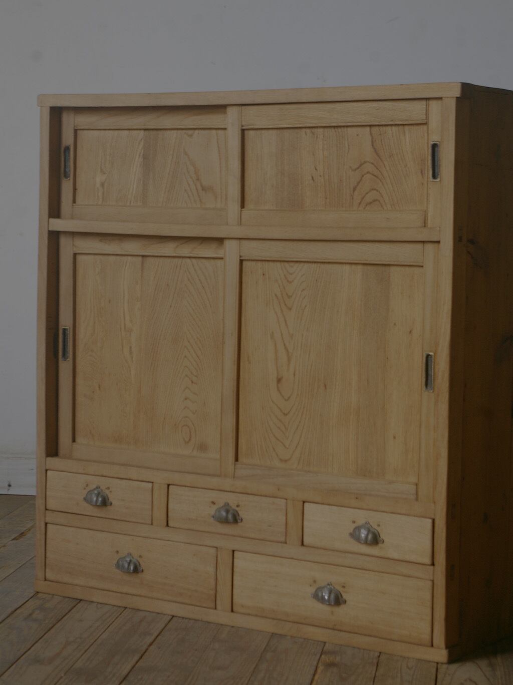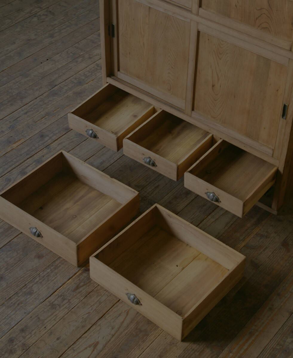 5杯の引き出しと古い無垢材の綺麗な木目がとても雰囲気の良いアンティーク戸棚です。