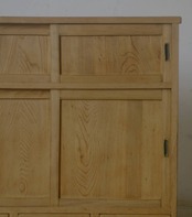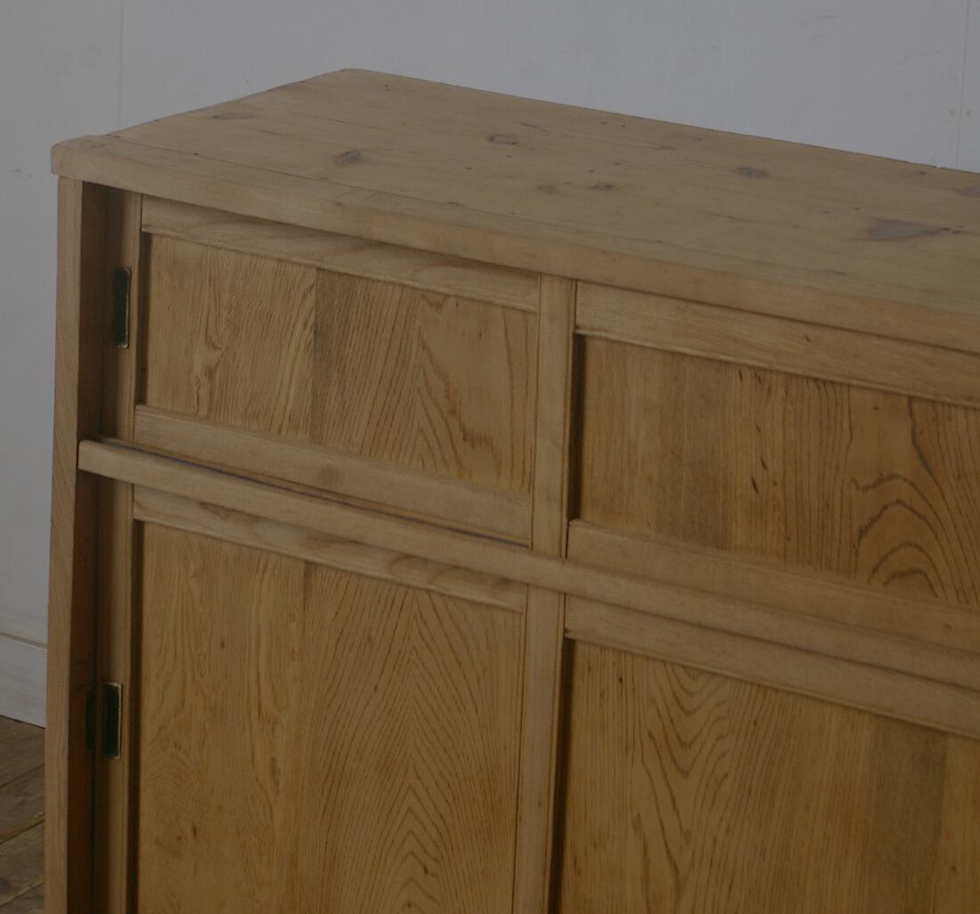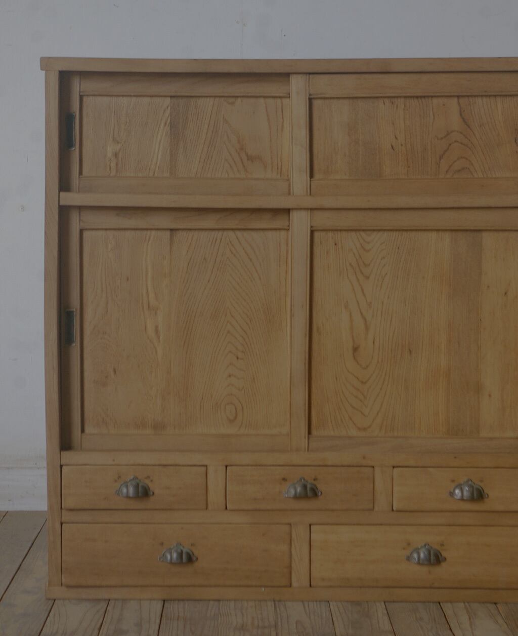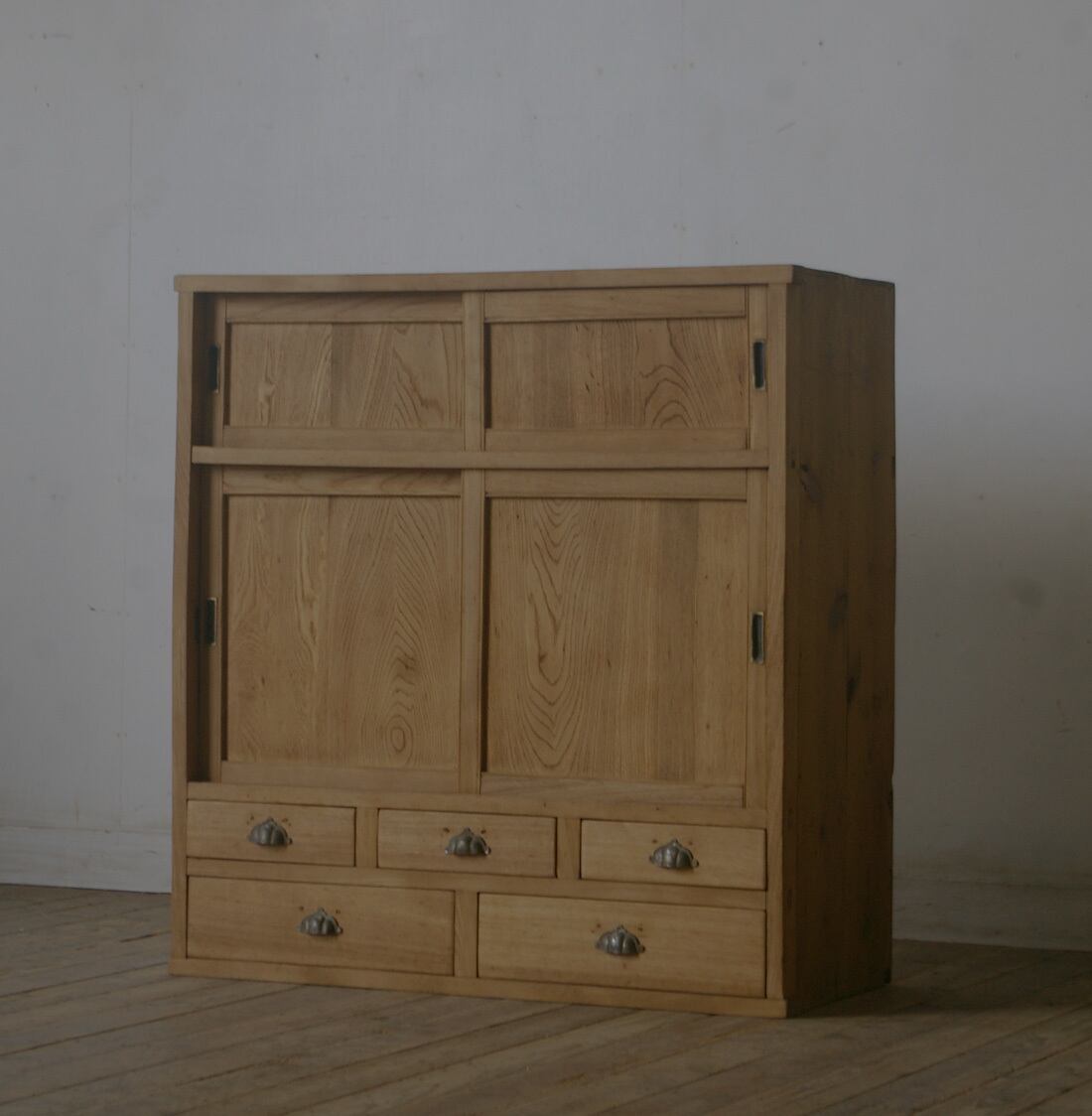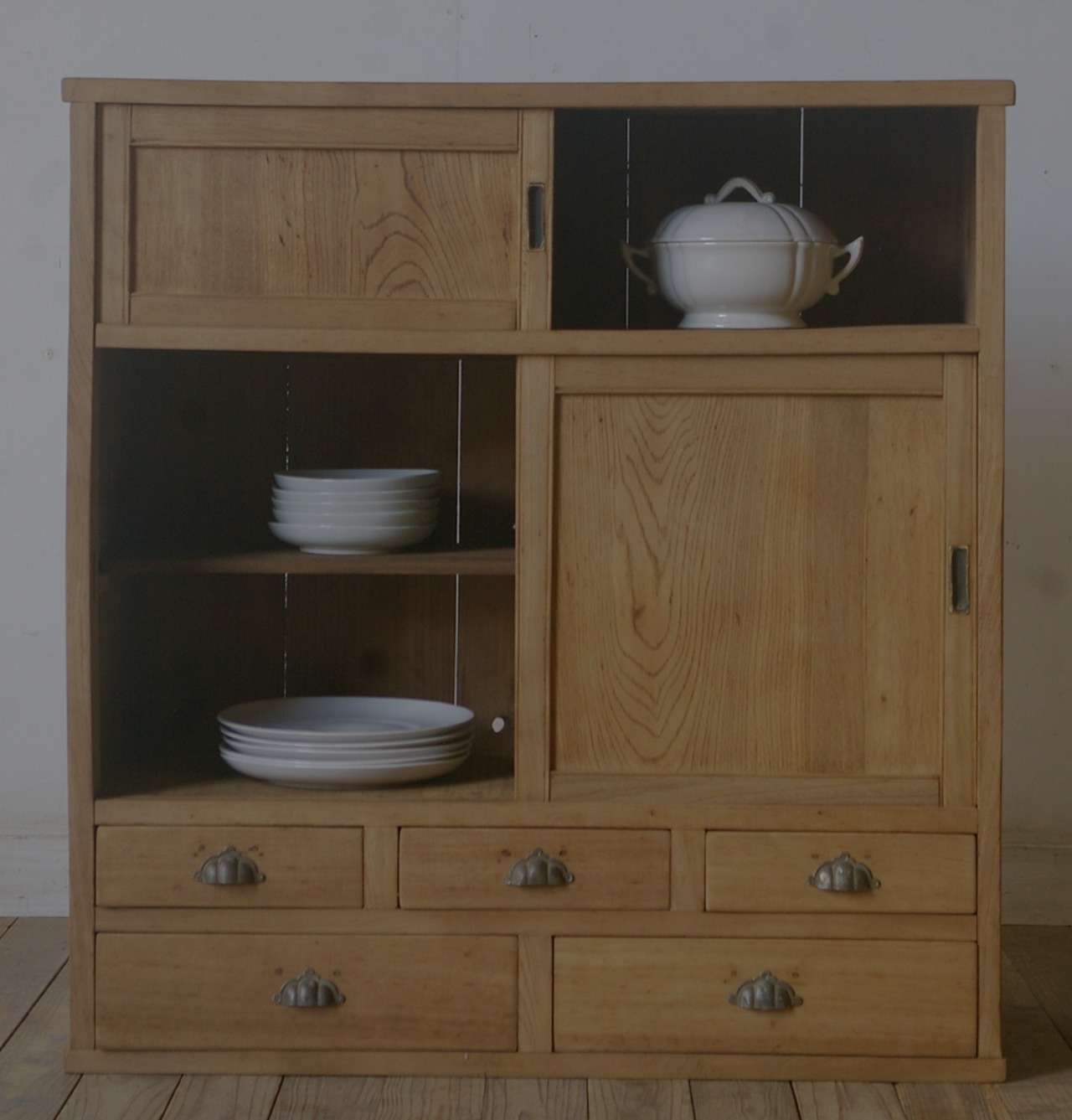 5杯の引き出しと古い無垢材の綺麗な木目がとても雰囲気の良いアンティーク戸棚です。