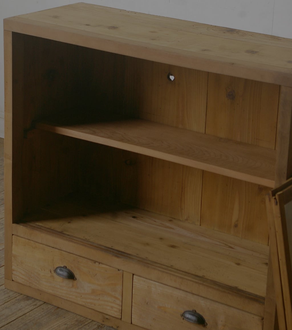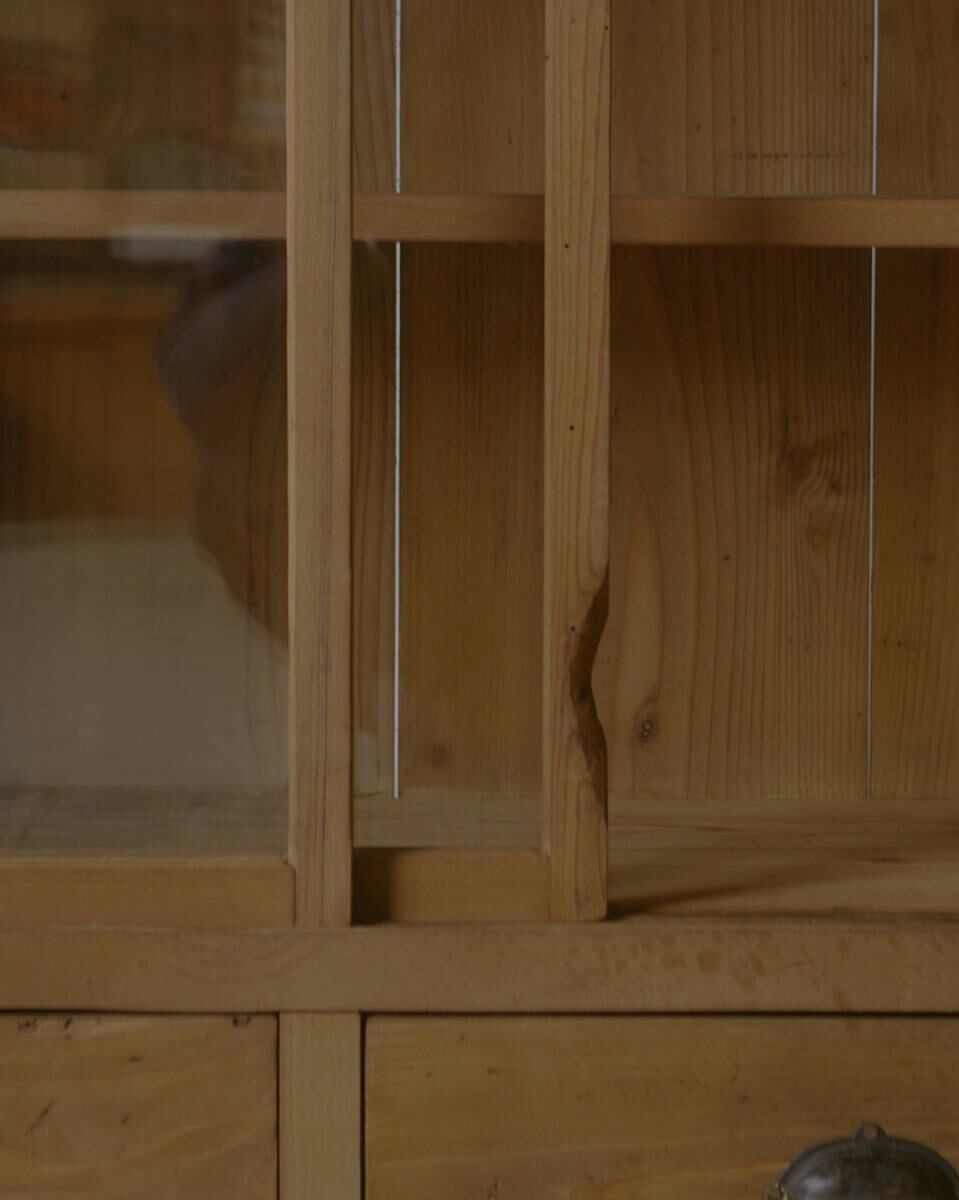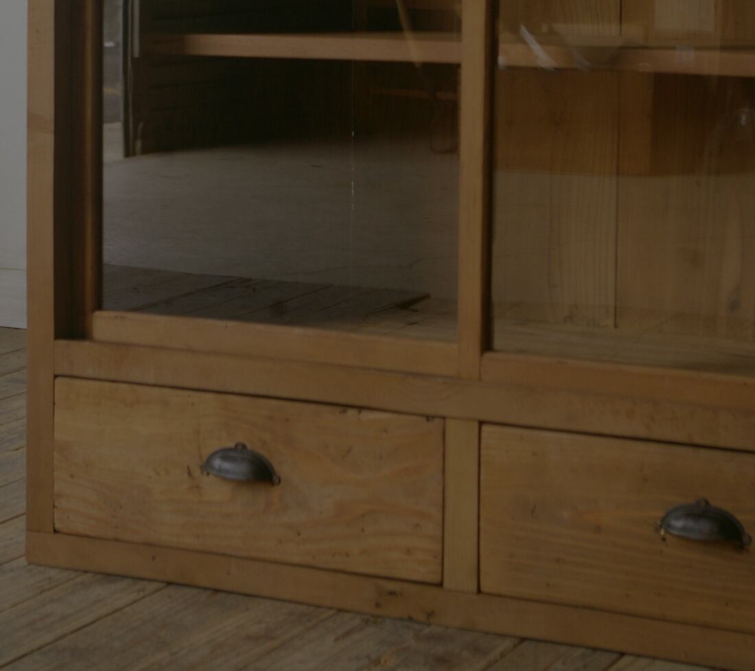 古い無垢材の綺麗な木目がとても雰囲気の良いアンティークガラス戸棚です。