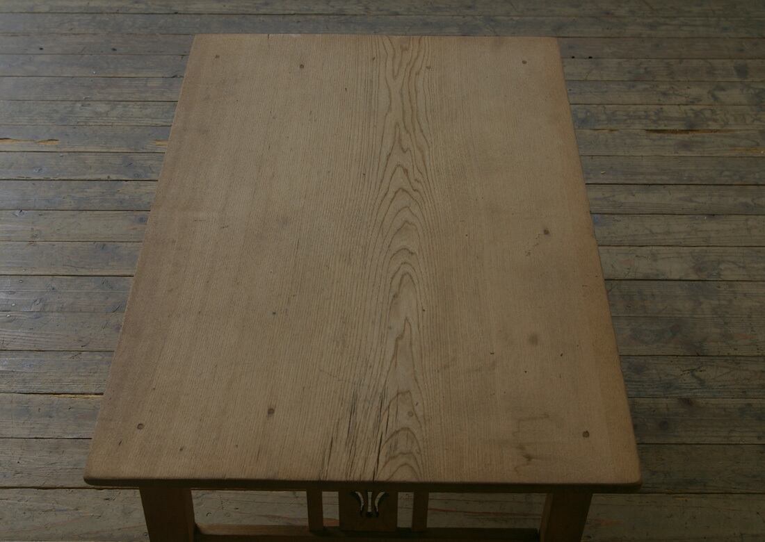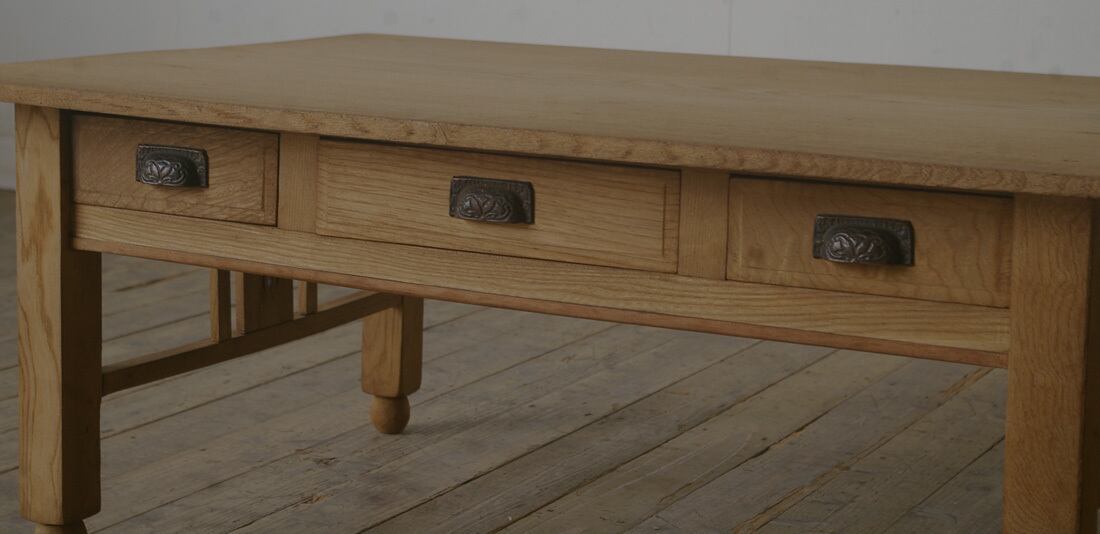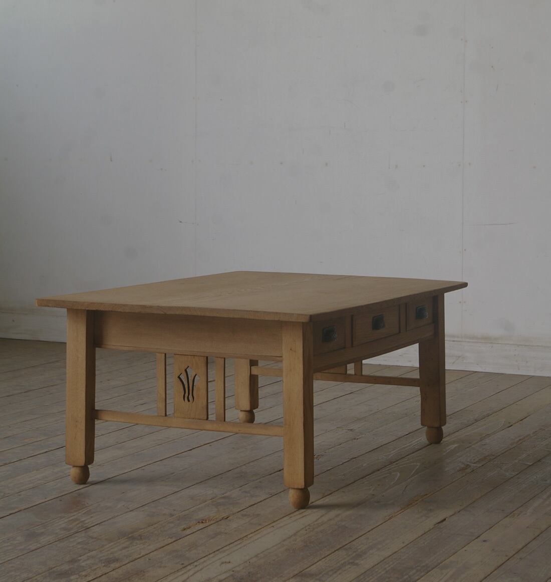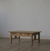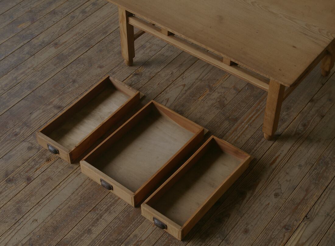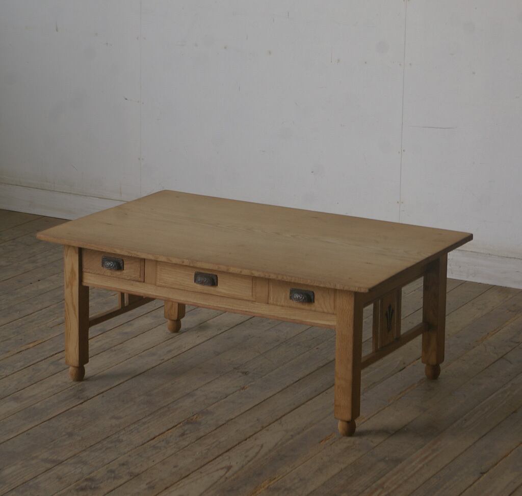 3杯の引き出しと古い楢材の綺麗な木目がとても雰囲気の良いアンティークローテーブルです。