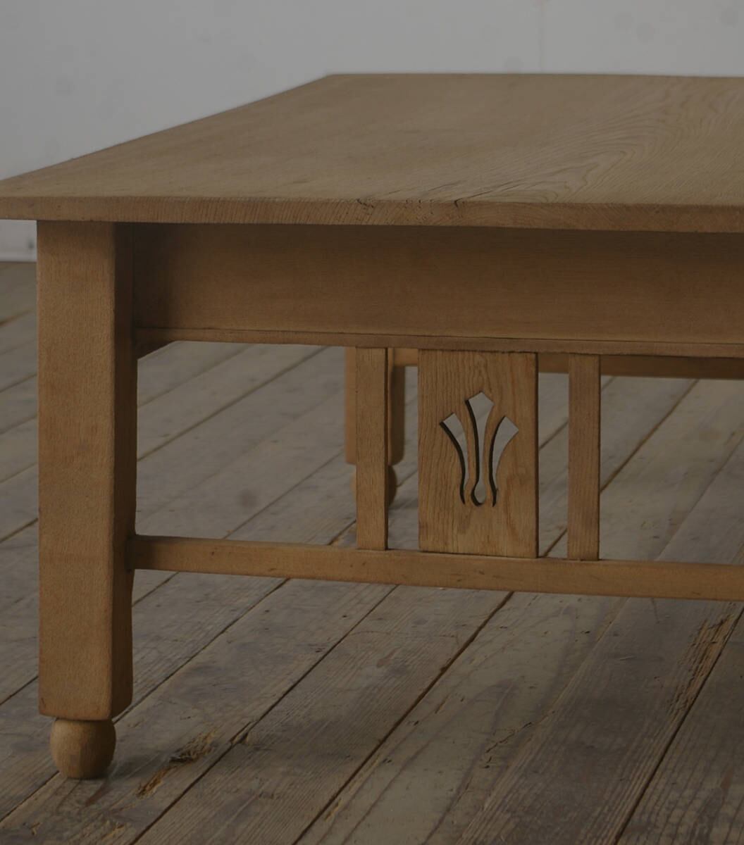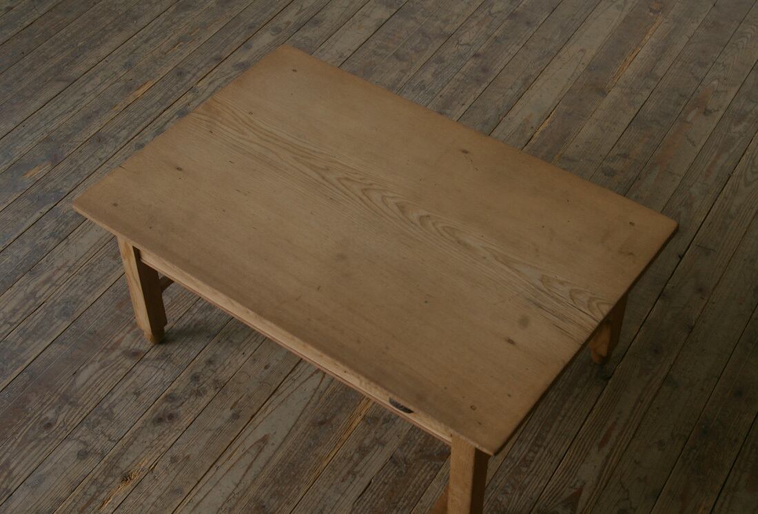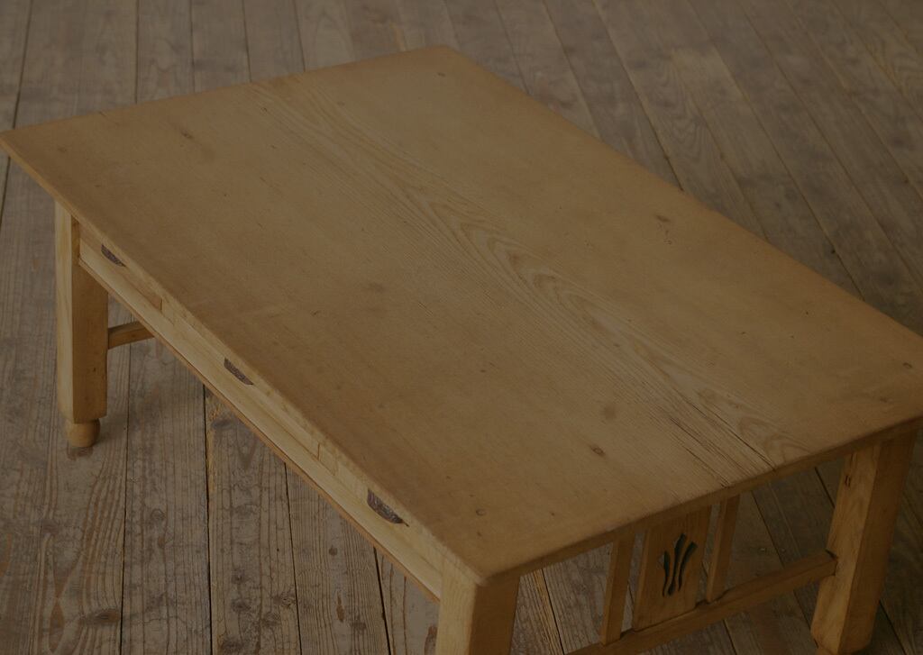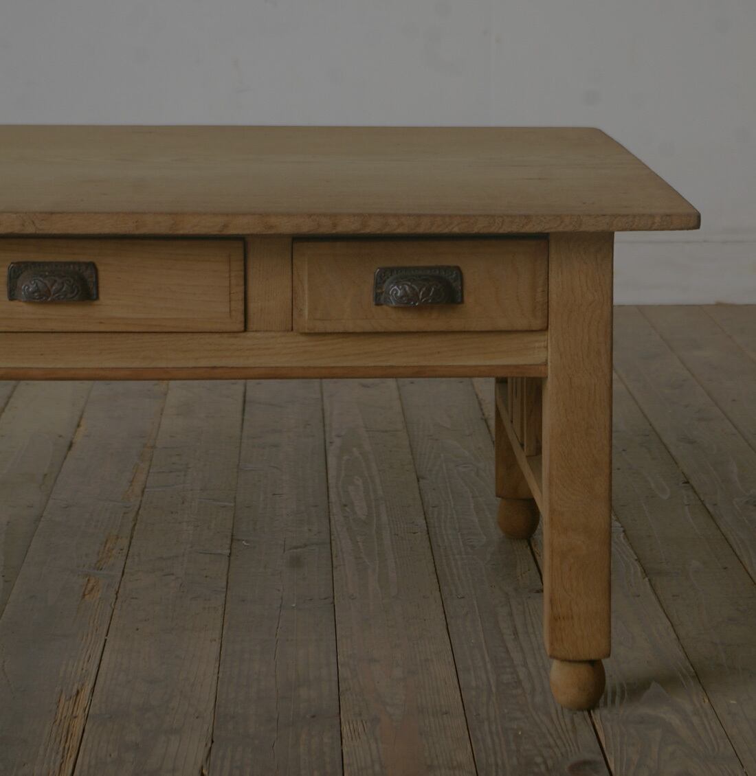 3杯の引き出しと古い楢材の綺麗な木目がとても雰囲気の良いアンティークローテーブルです。