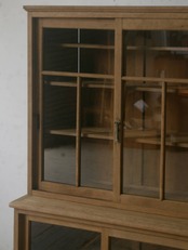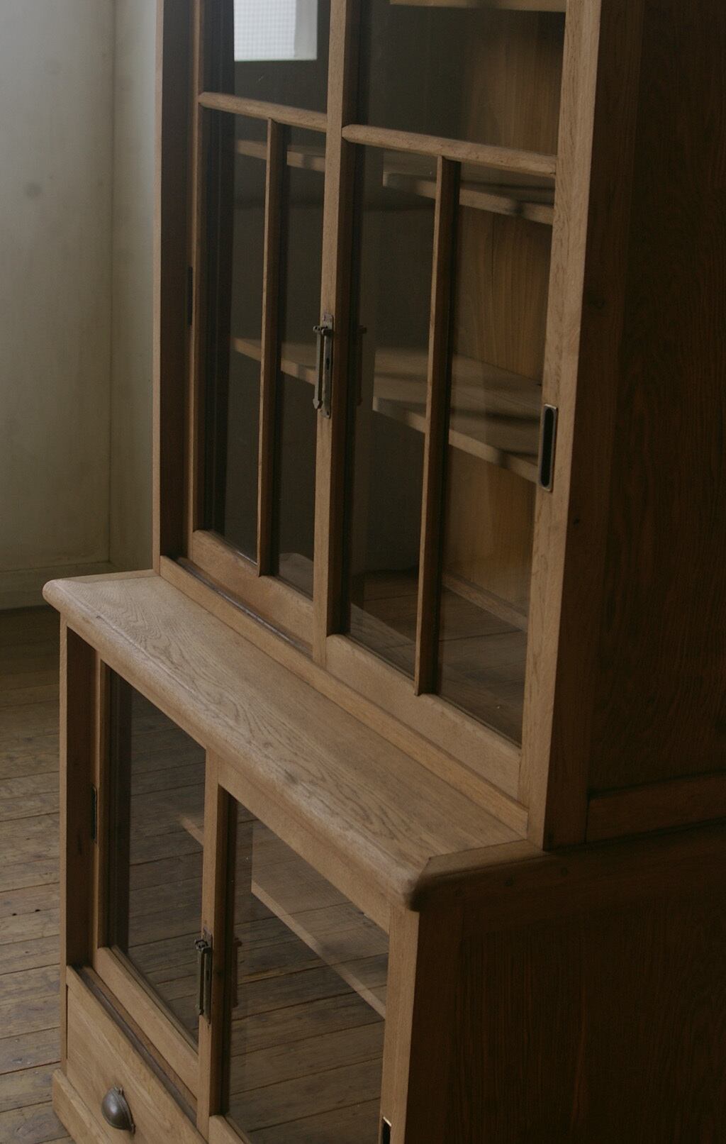 造りも良く、4枚のガラス戸と2杯の引き出し、古い楢材の綺麗な木目がとても雰囲気の良いアンティークガラス戸棚です。