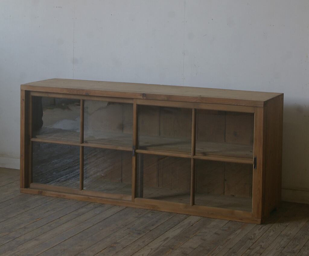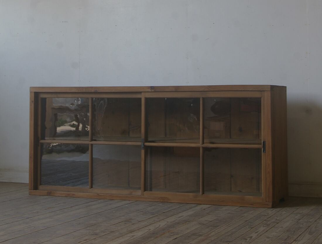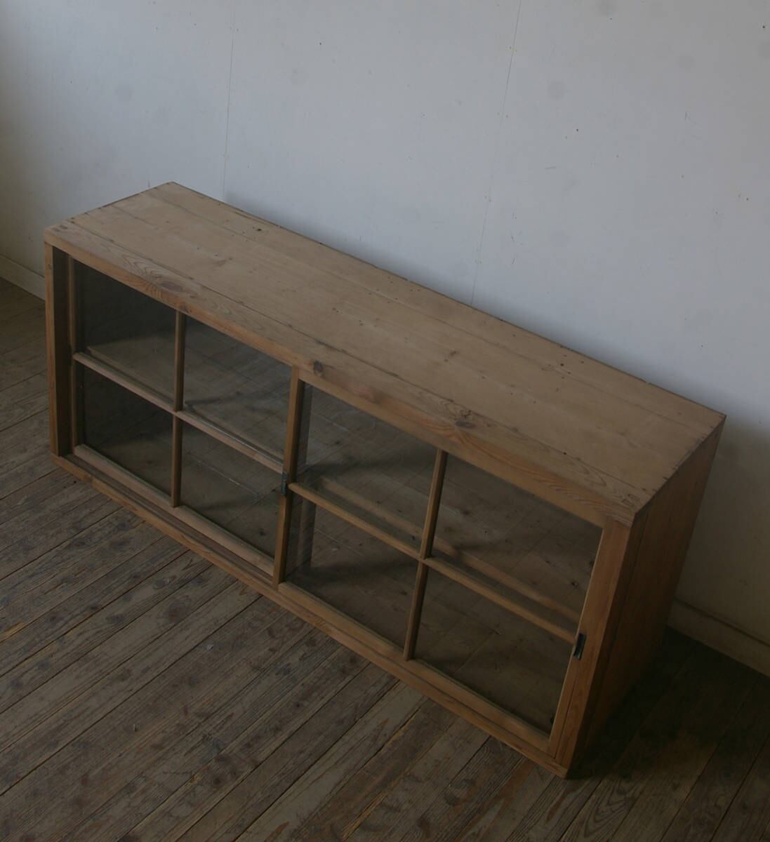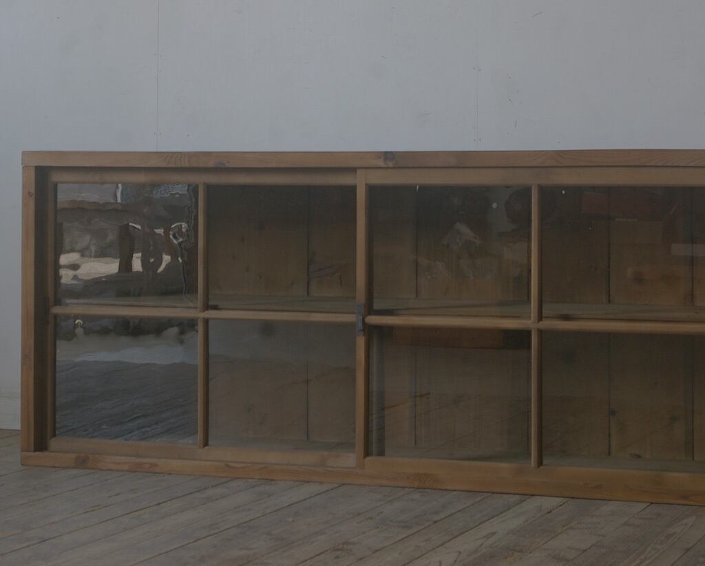 大きな2枚の十字ガラス戸と古い無垢材の綺麗な木目がとても雰囲気の良いアンティーク横長ガラス戸棚です。