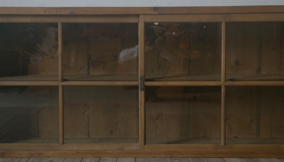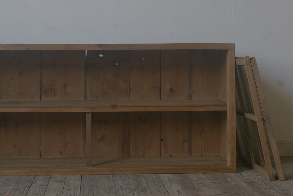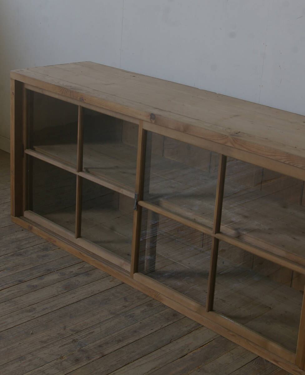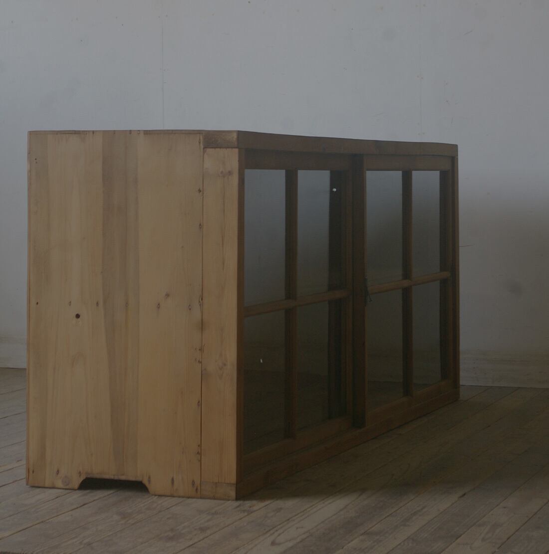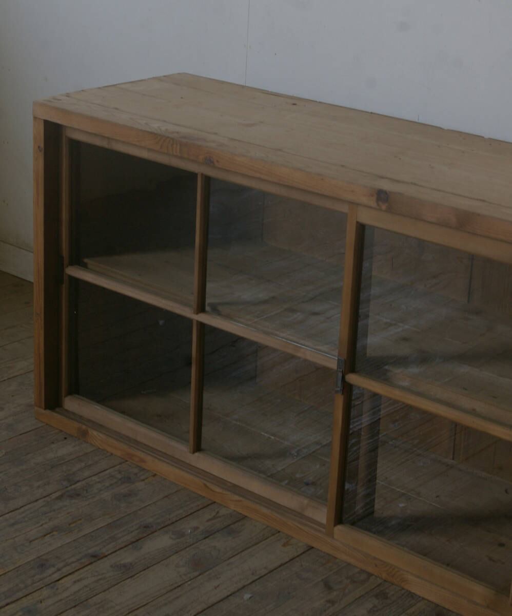大きな2枚の十字ガラス戸と古い無垢材の綺麗な木目がとても雰囲気の良いアンティーク横長ガラス戸棚です。