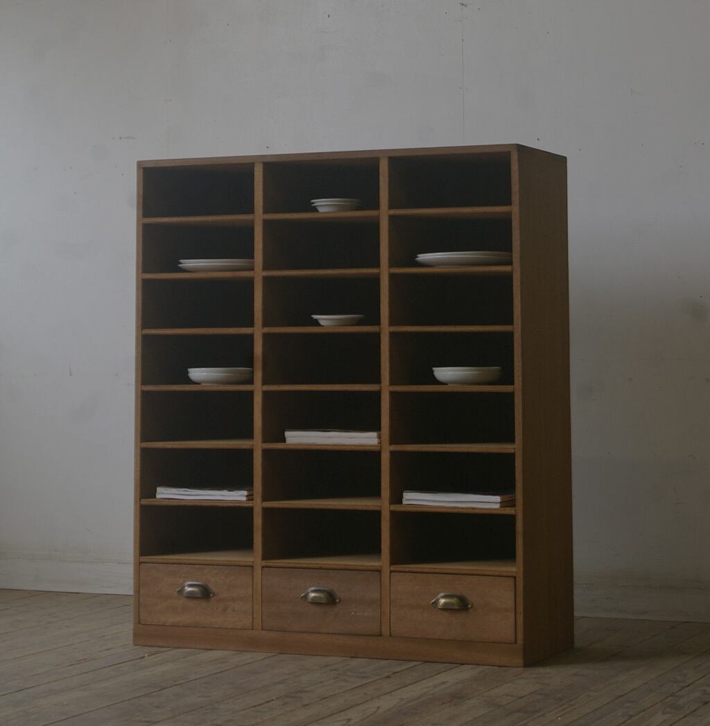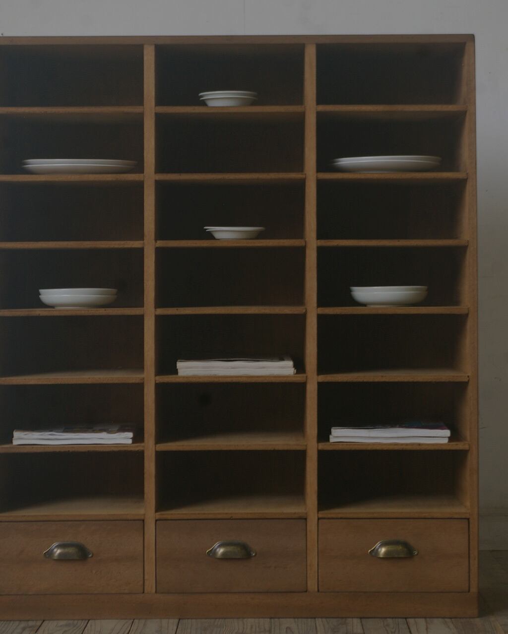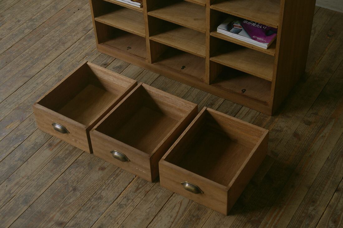 シンプルなデザインで収納力もあり、とても存在感のあるアンティーク引き出し3杯升目棚です。
