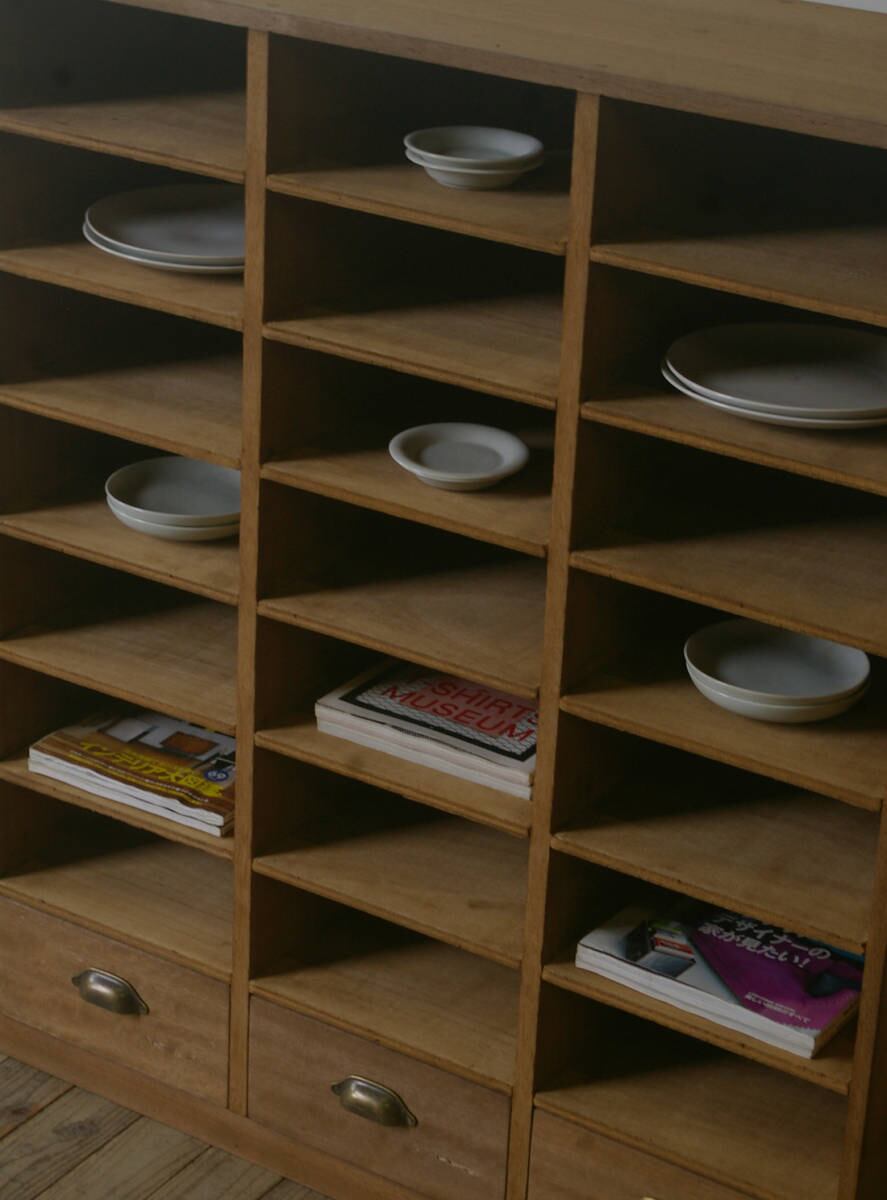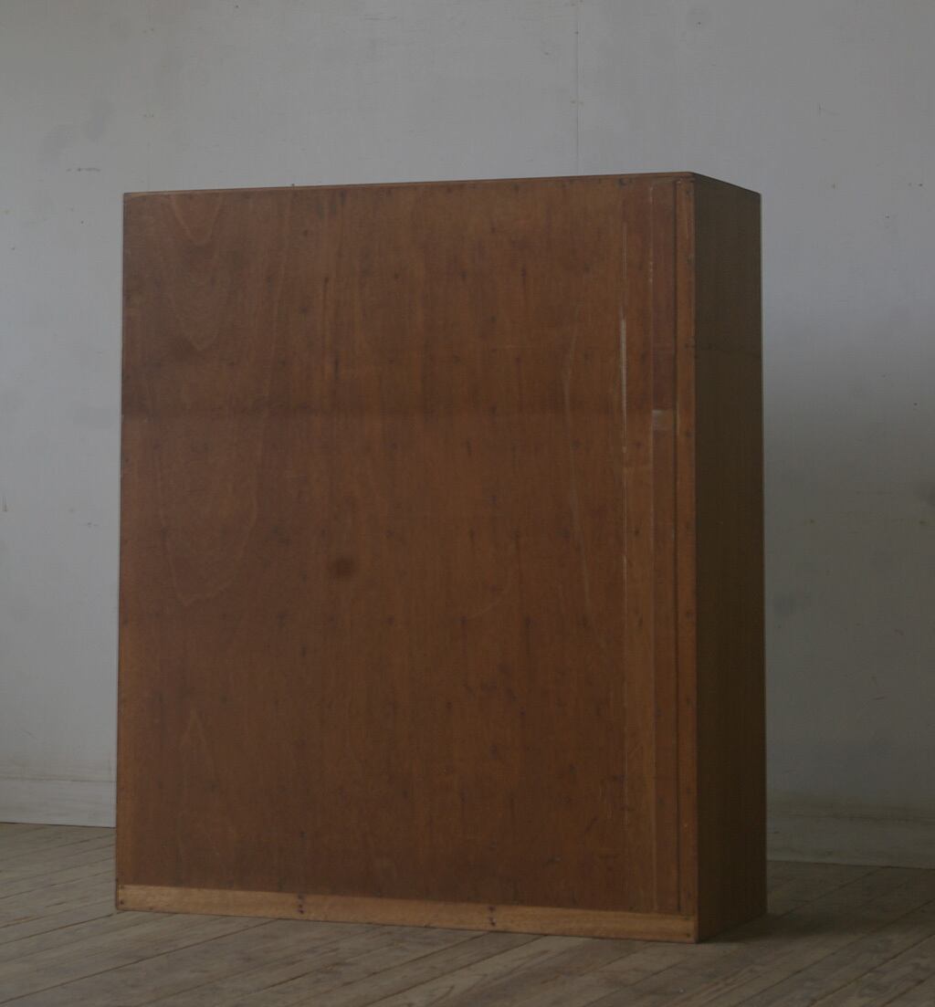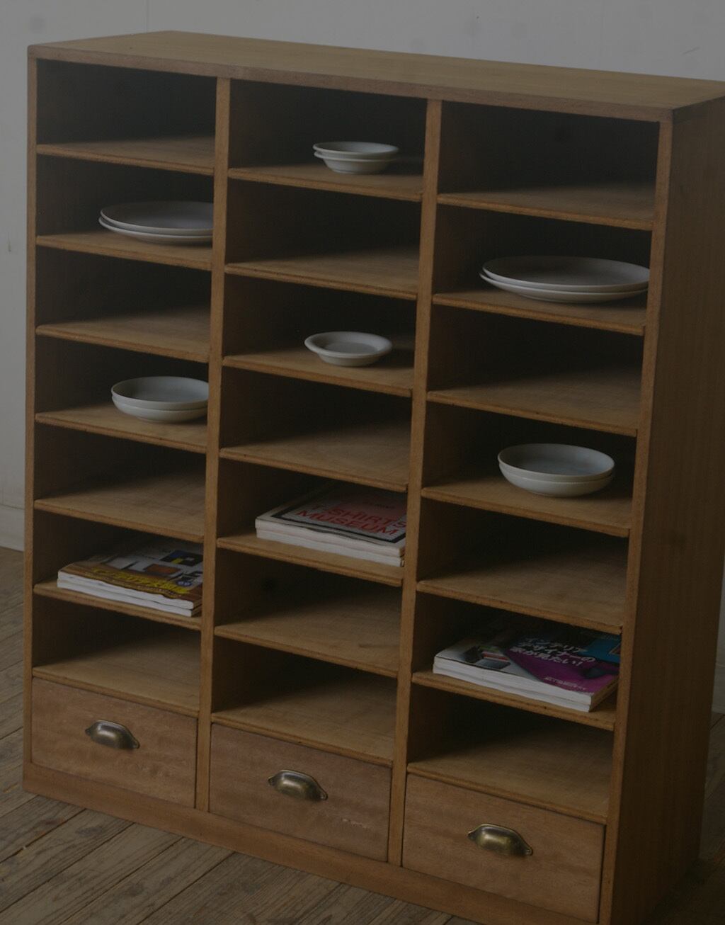シンプルなデザインで収納力もあり、とても存在感のあるアンティーク引き出し3杯升目棚です。