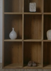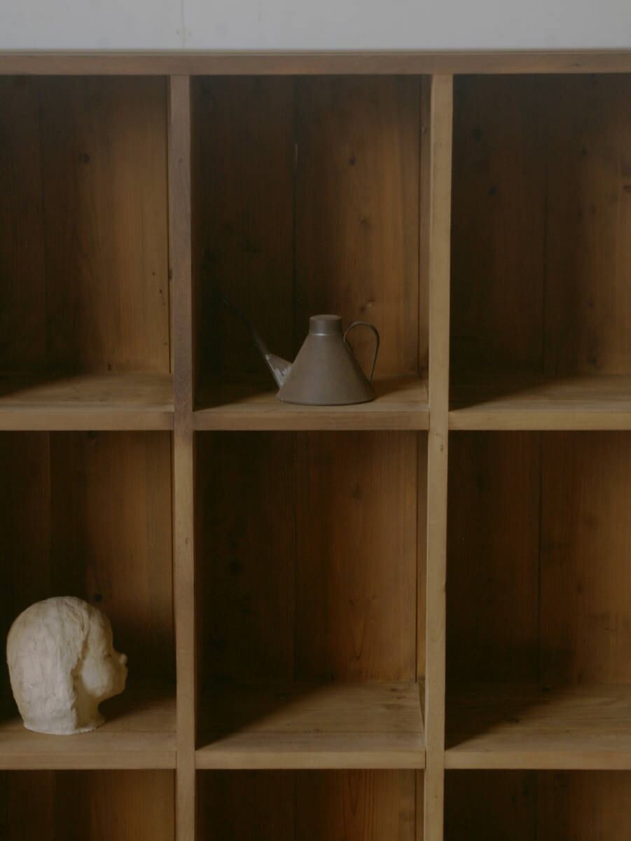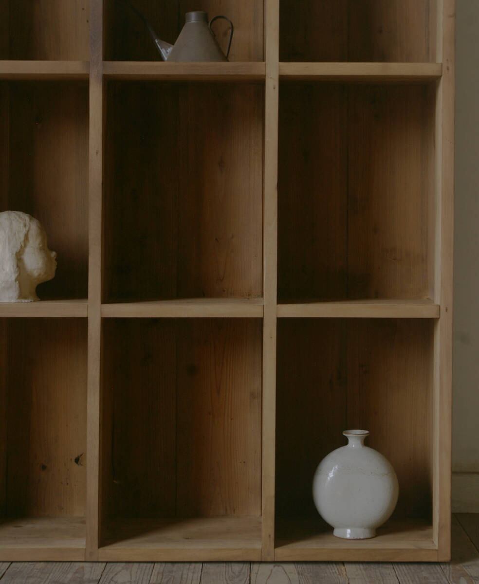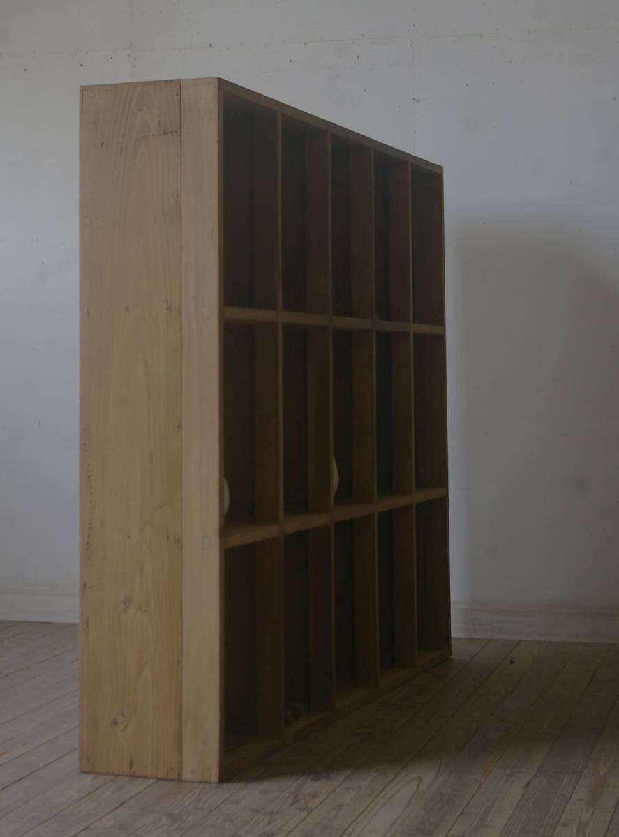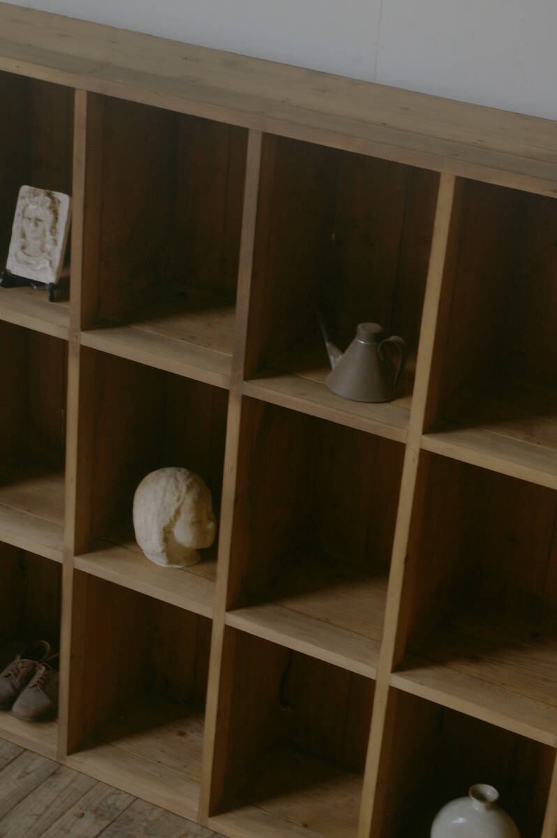 薄型のシンプルなデザインで造りも良く、とても存在感のアンティーク大きな升目棚です。