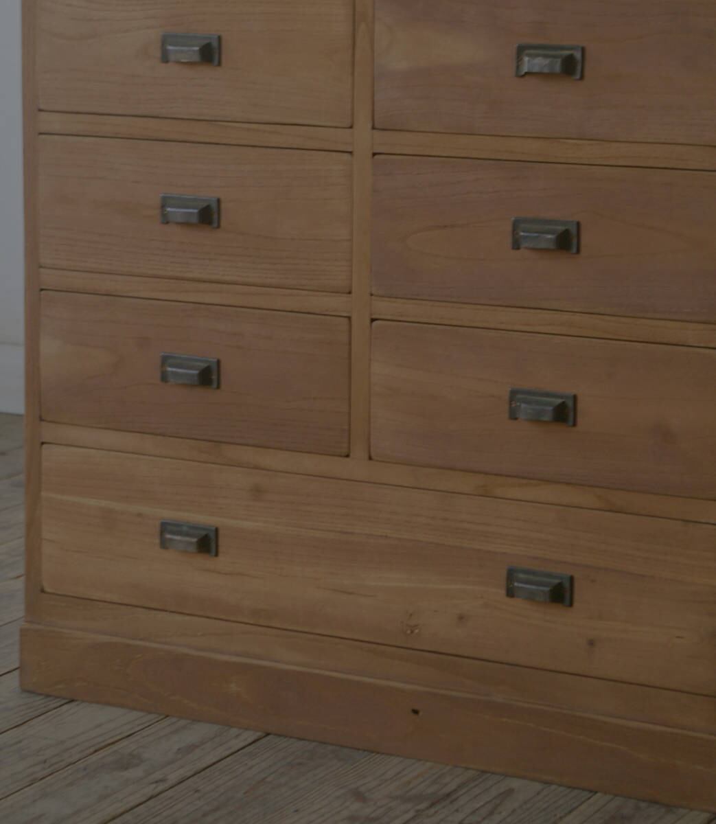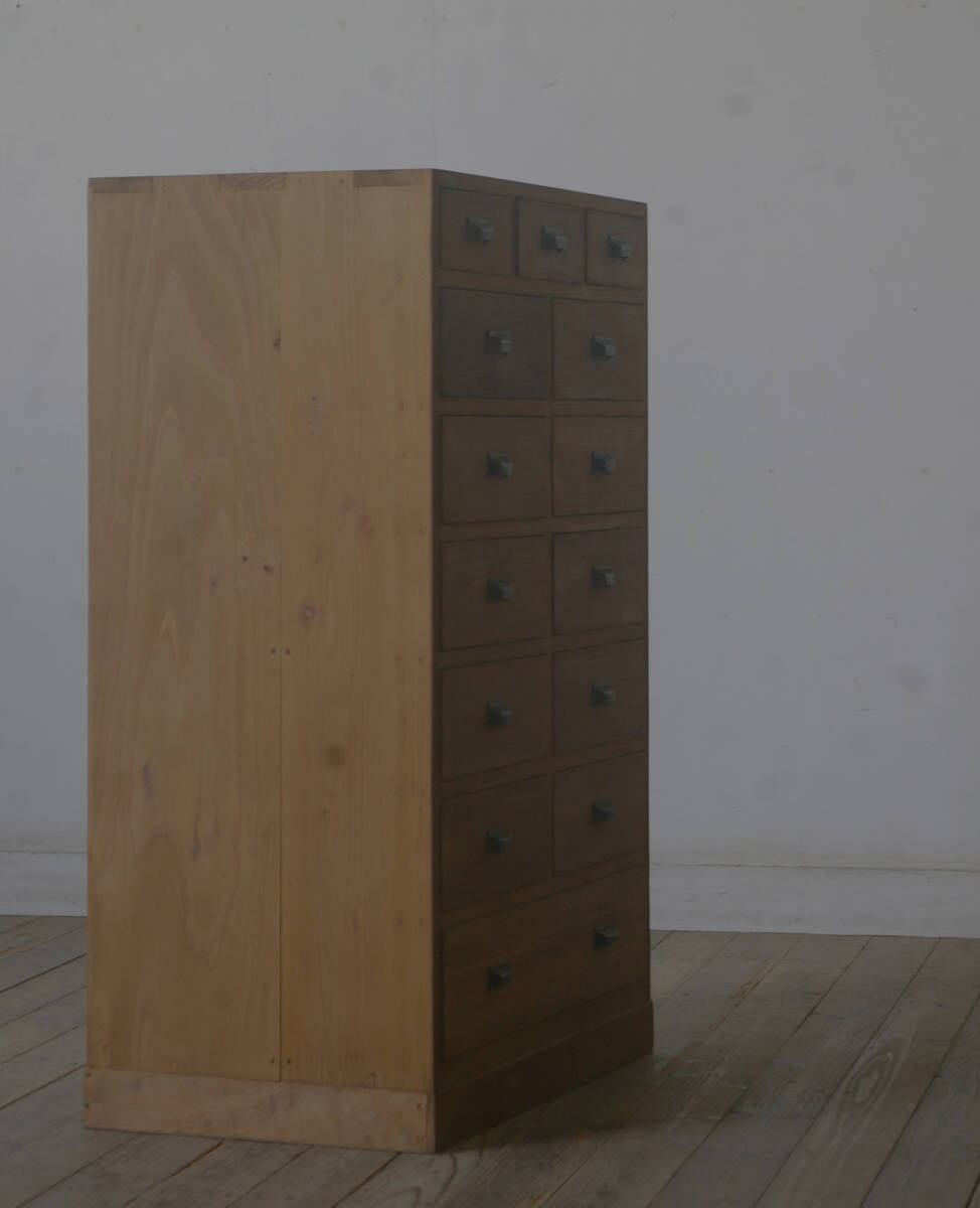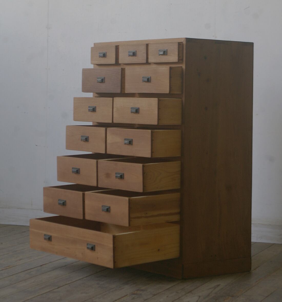 古い薬屋で使用されていたチェストになりますので、引き出し内部に多少薬品の匂いが残っております。(気になる方はご入札はお控えくださいませ。)