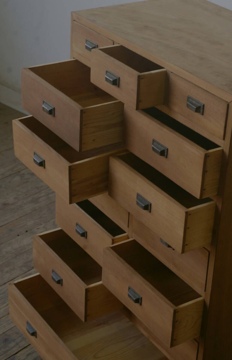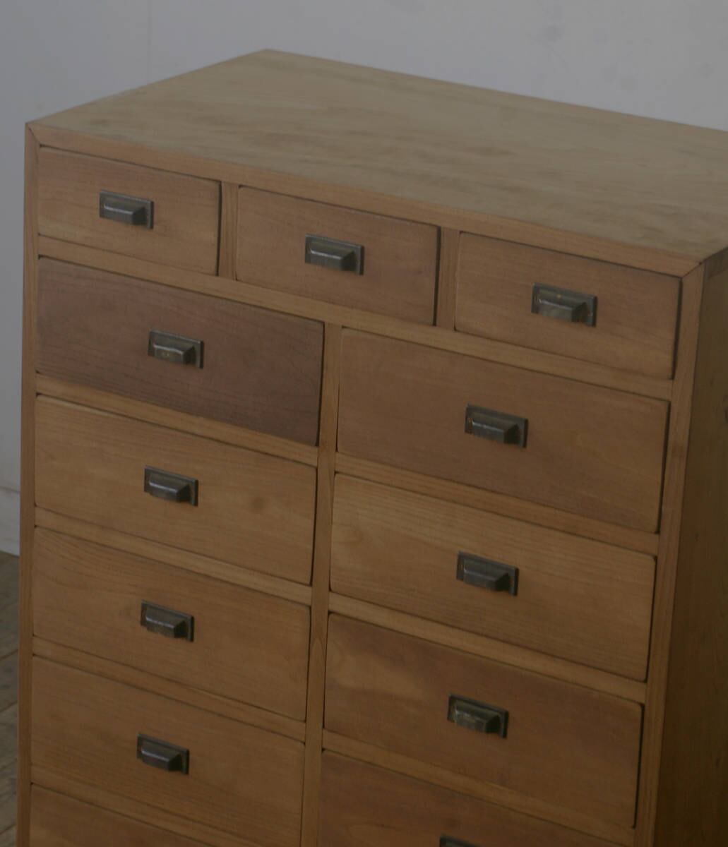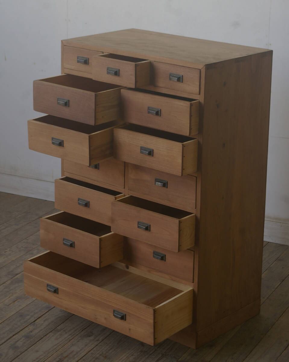 大小計14杯の引き出しと古い無垢材の綺麗な木目がとても雰囲気のの良いアンティークチェストです。