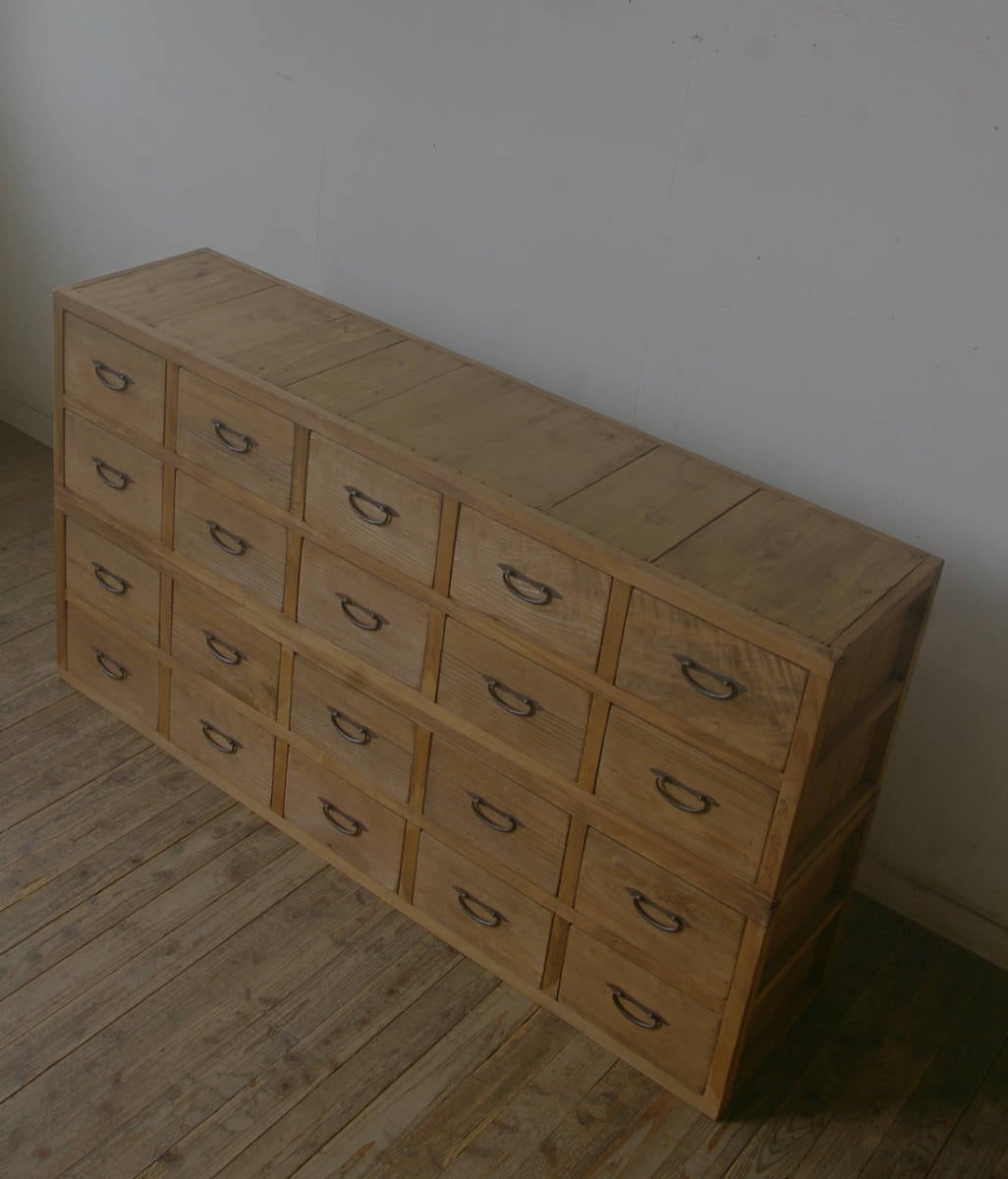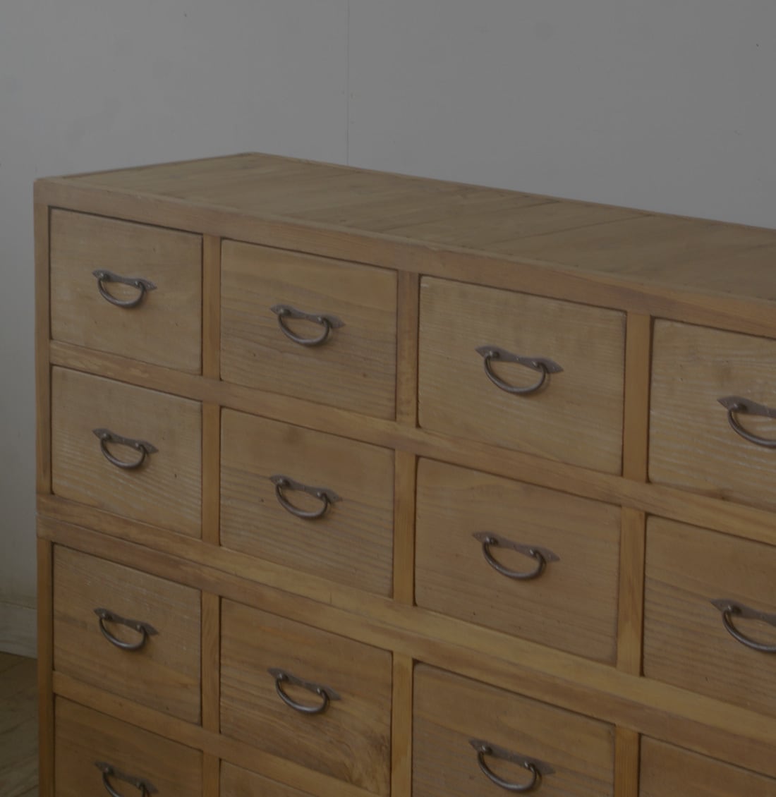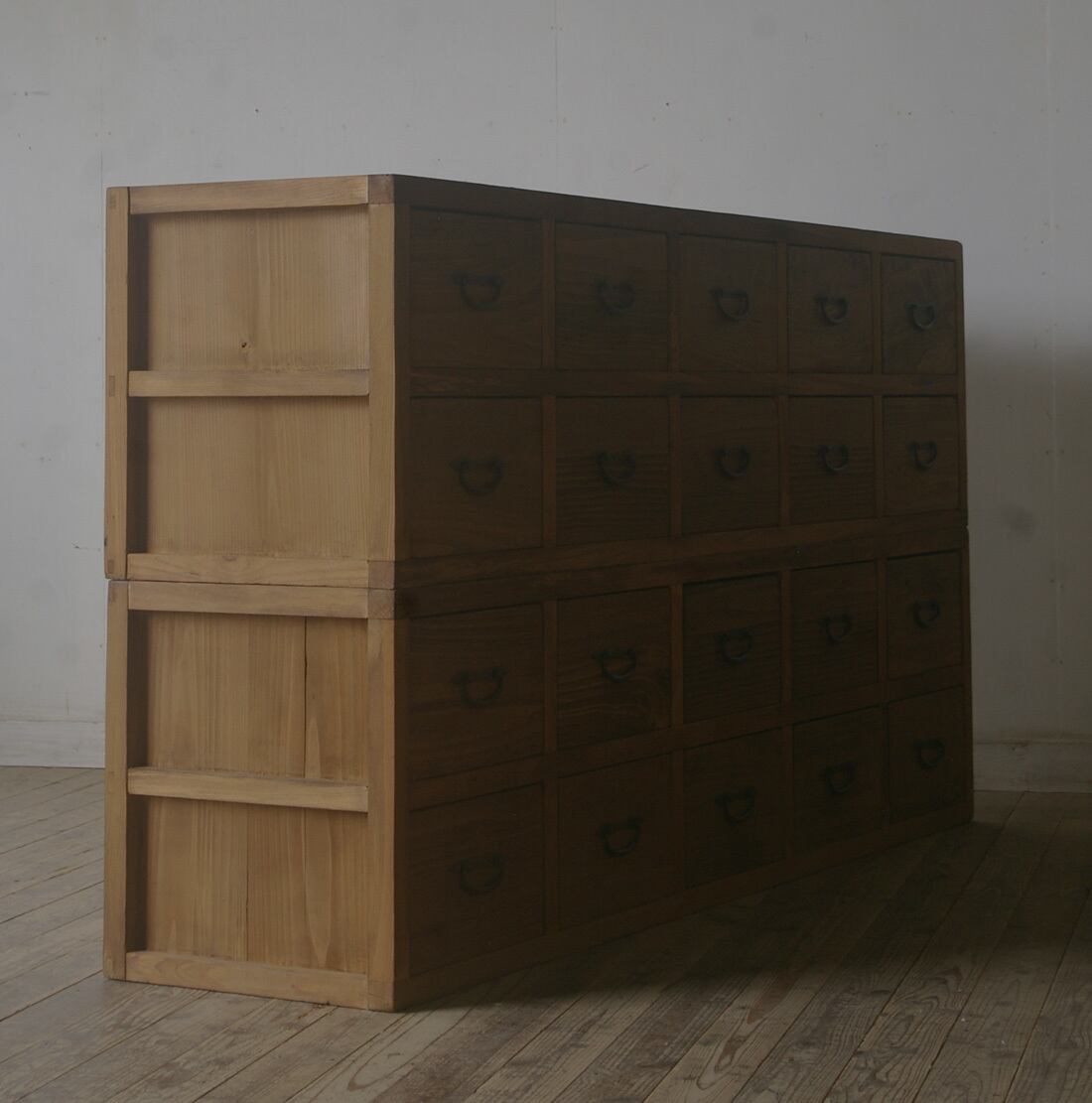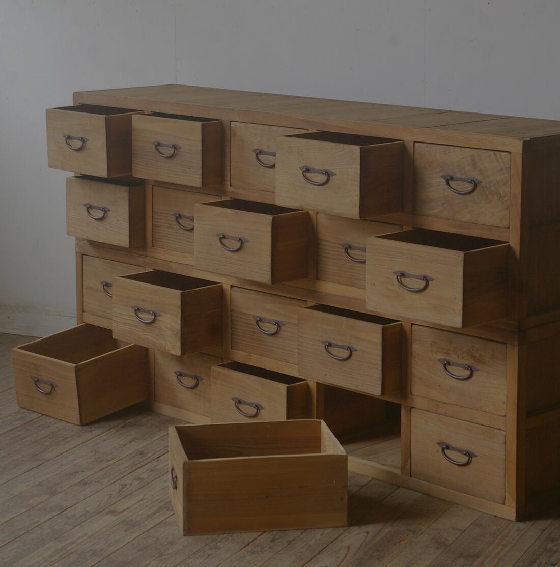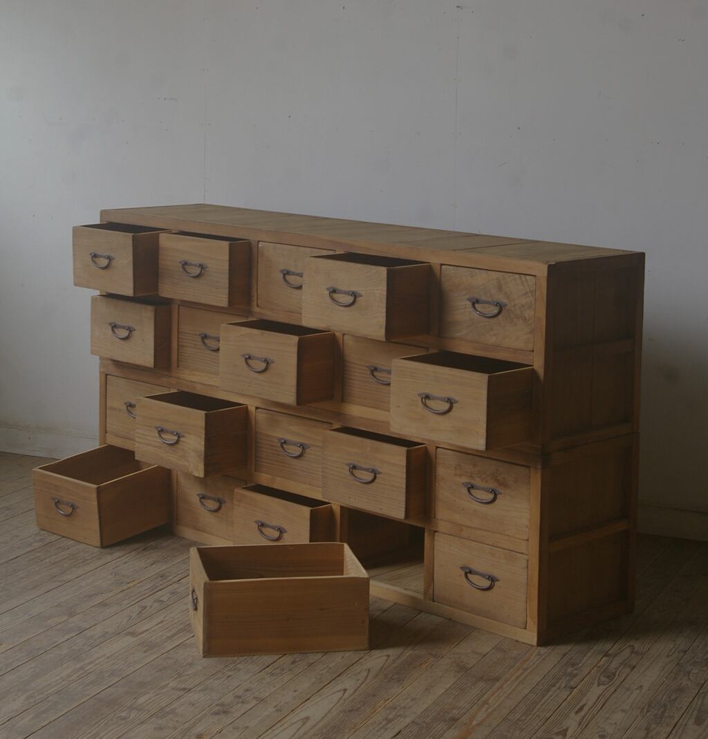 計20杯の引き出しと古い無垢材の綺麗な木目がとても雰囲気のの良いアンティーク道具箪笥です。