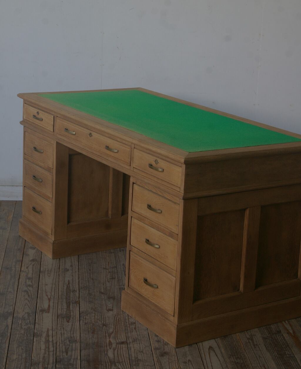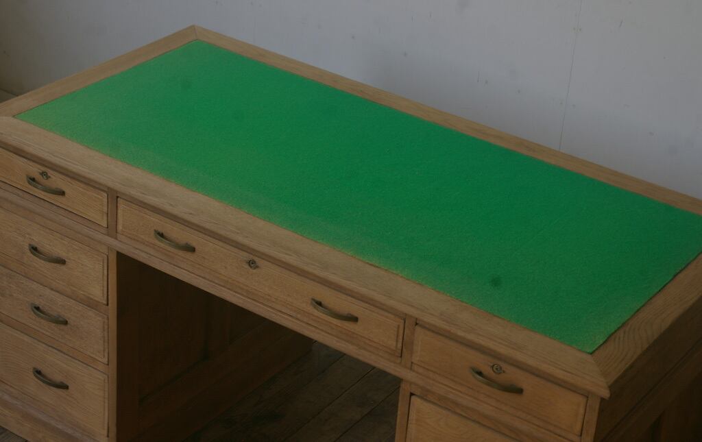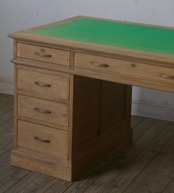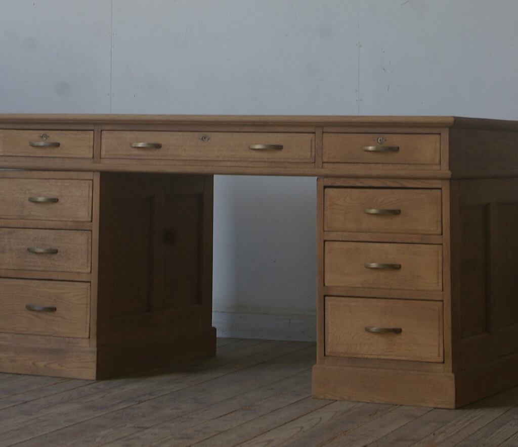 重厚な古い楢材の綺麗な木目がとても雰囲気の良いアンティーク分解式両袖机です。