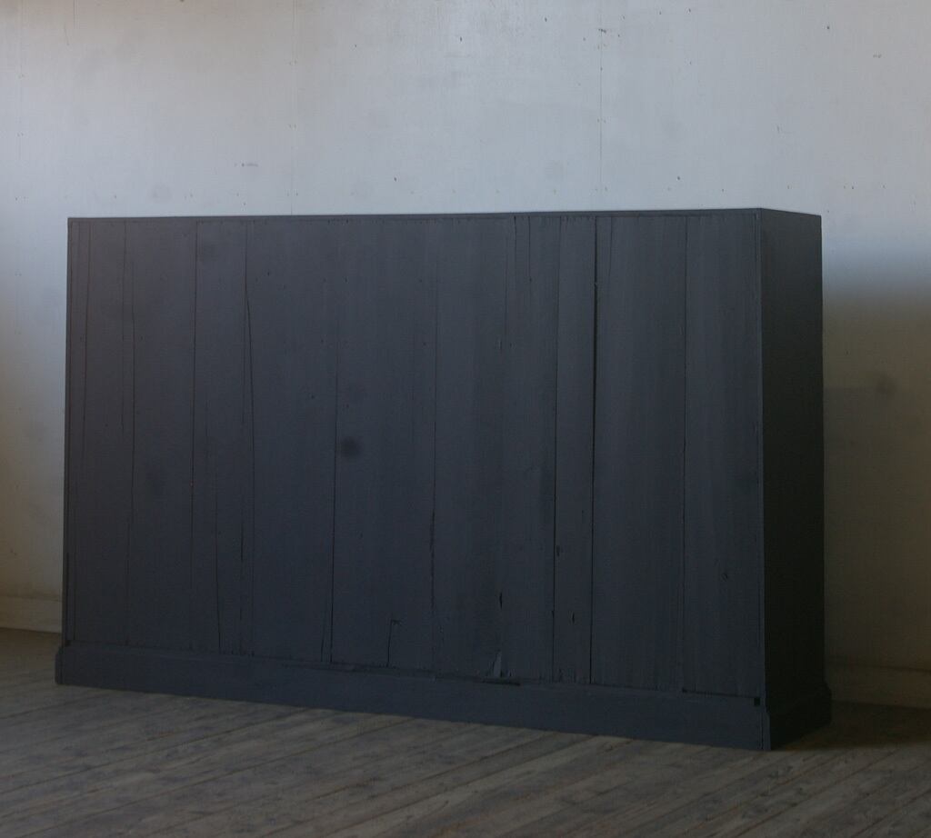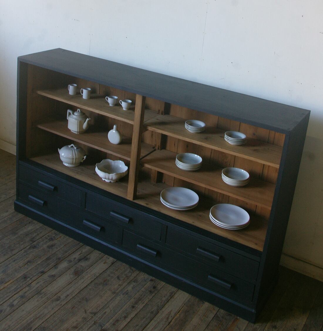 造りも良く、収納力もあるアンティーク横長陳列棚です。