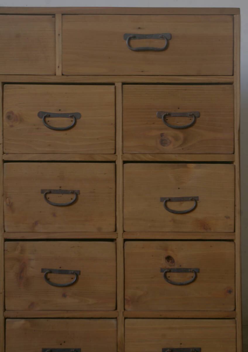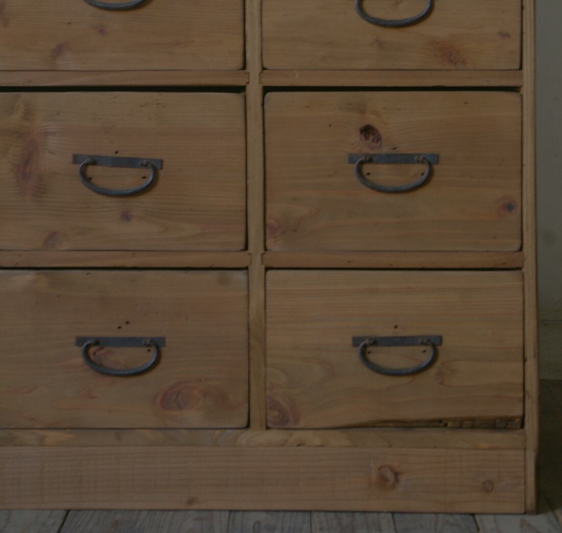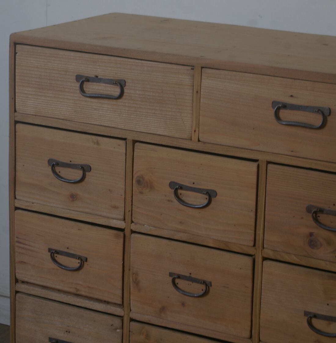 14杯の引き出しと古い無垢材の綺麗な木目がとても雰囲気の良いアンティーク道具箪笥です。