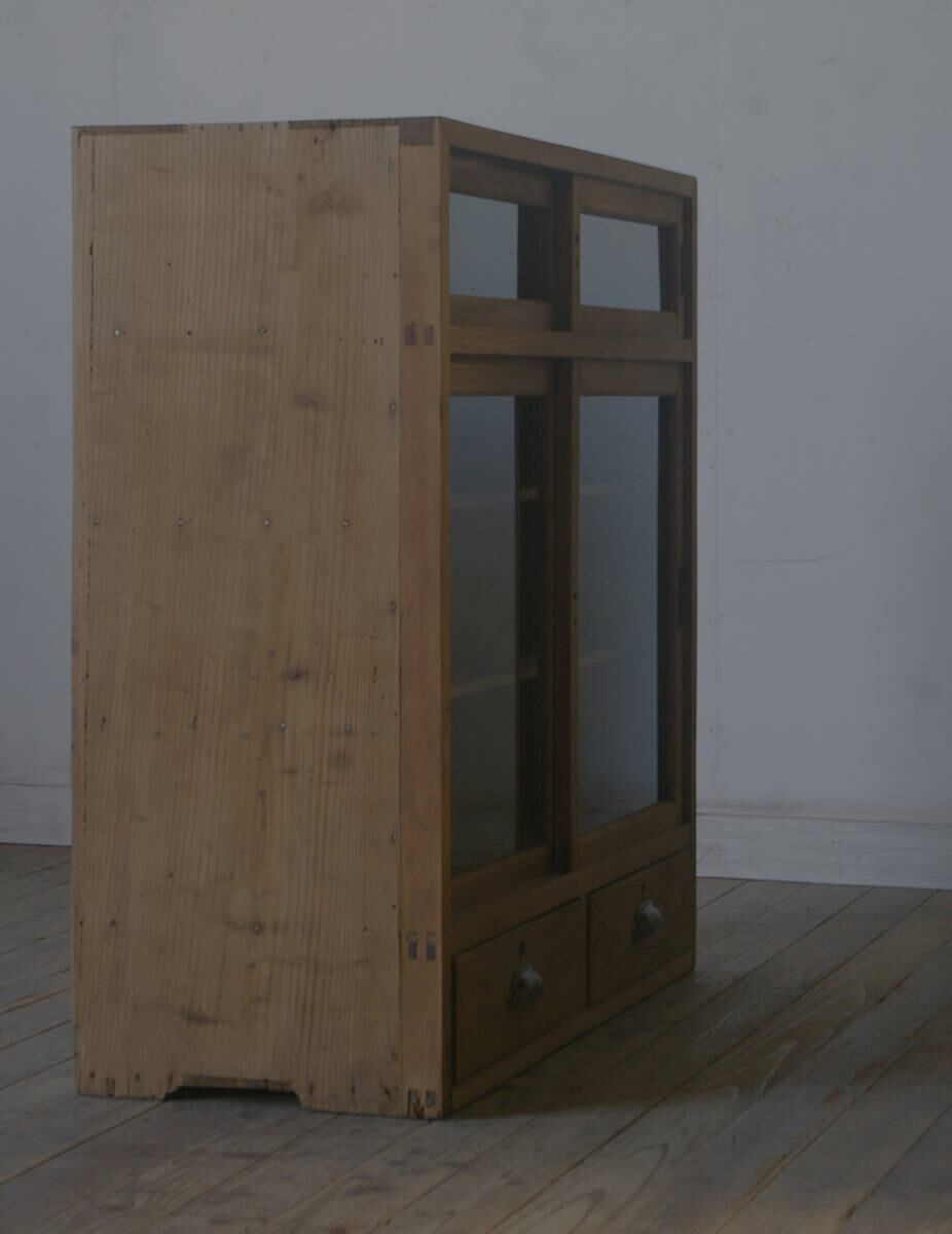 大小4枚のガラス戸と古い無垢材の綺麗な木目がとても雰囲気の良いアンティークガラス戸棚です。