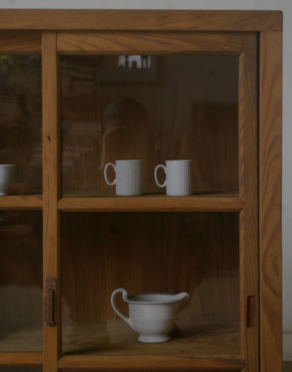 2枚のガラス戸と古い無垢材の綺麗な木目がとても雰囲気の良いアンティークガラス戸棚です。