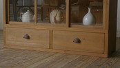2枚のガラス戸と3杯の引き出し、古い無垢材の綺麗な木目がとても雰囲気の良いアンティークガラス戸棚です。