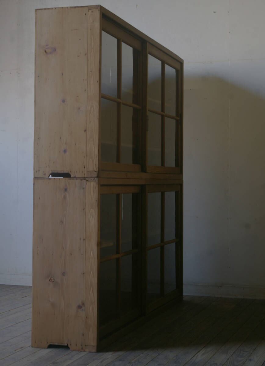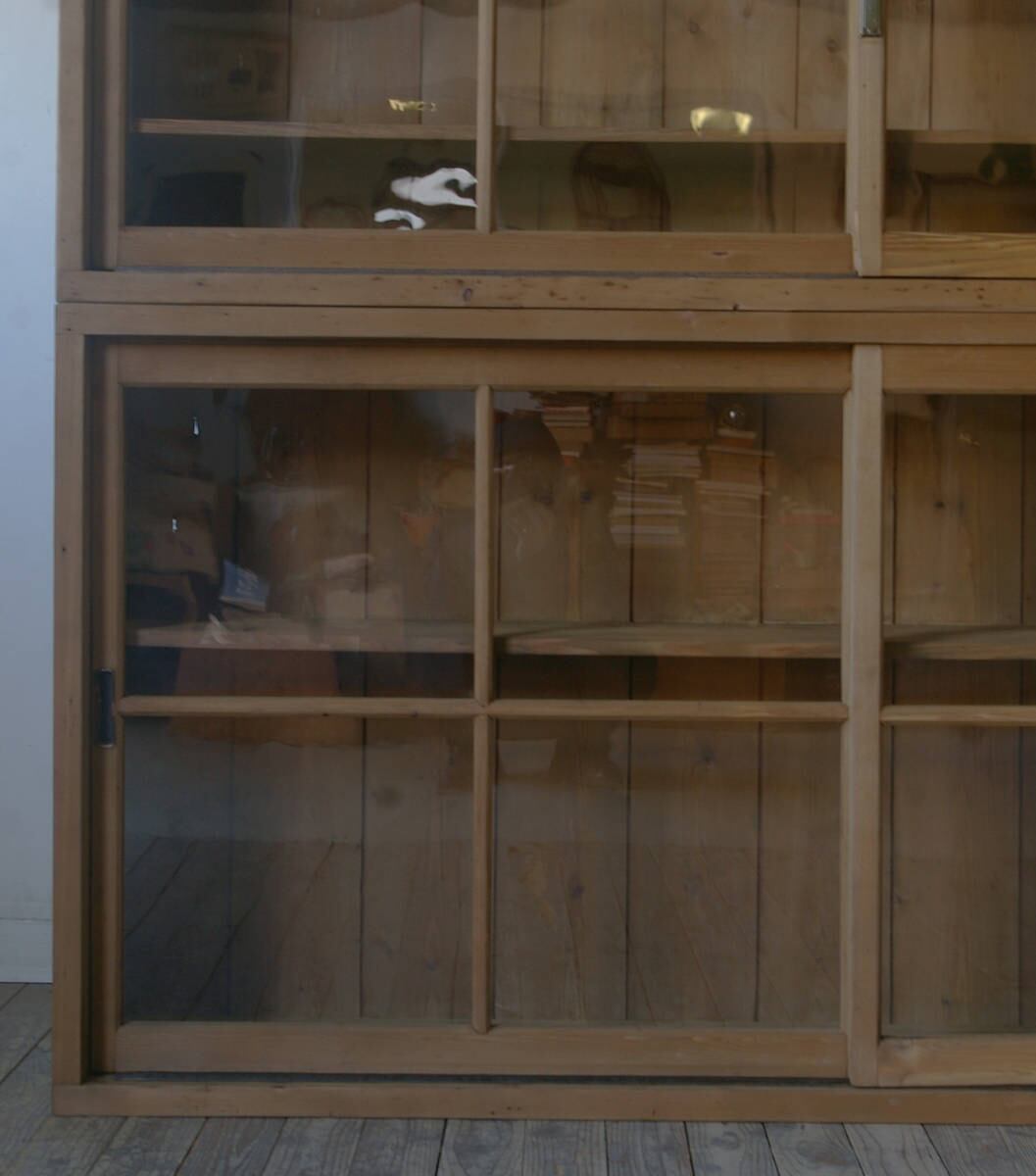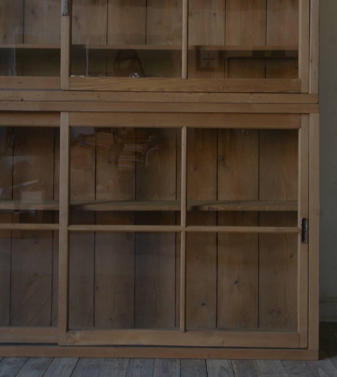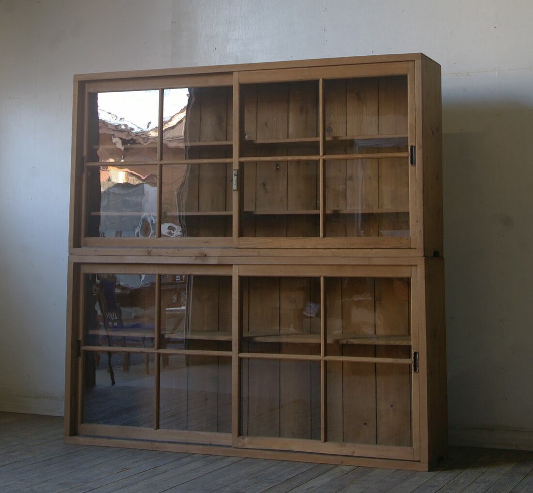 大きな4枚の十字ガラス戸と古い無垢材の綺麗な木目がとても雰囲気の良いアンティーク重ねガラス戸棚です。