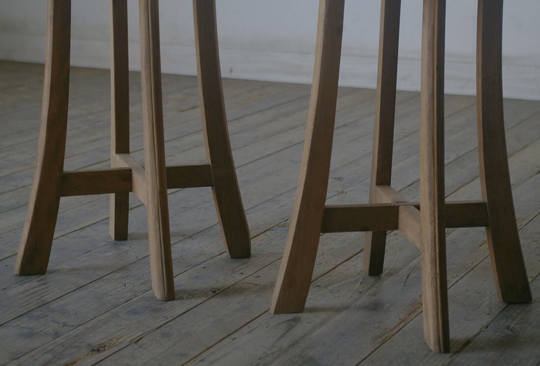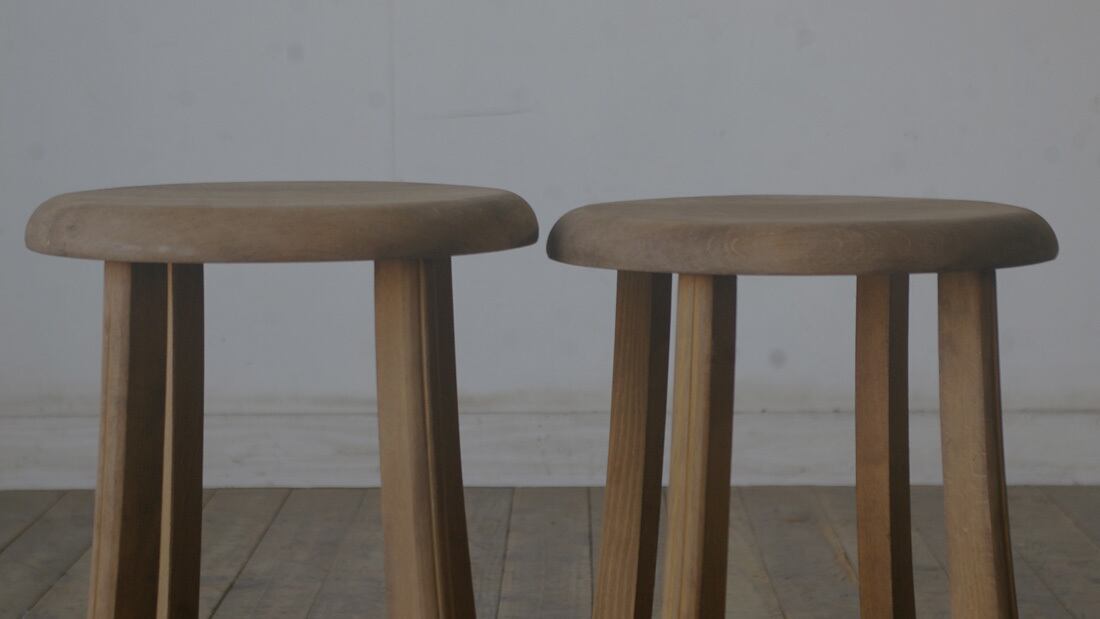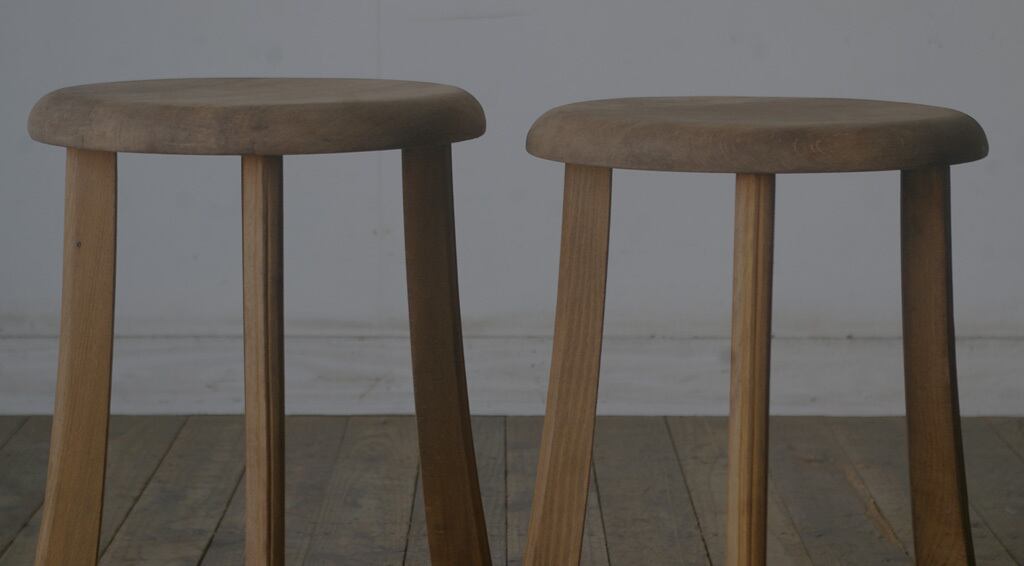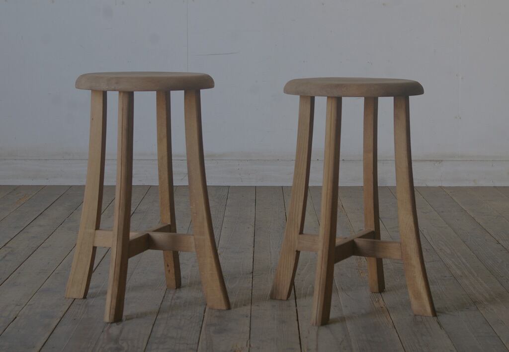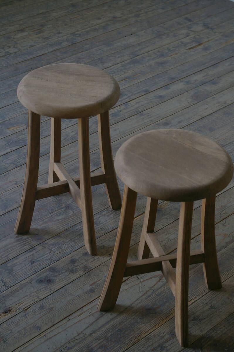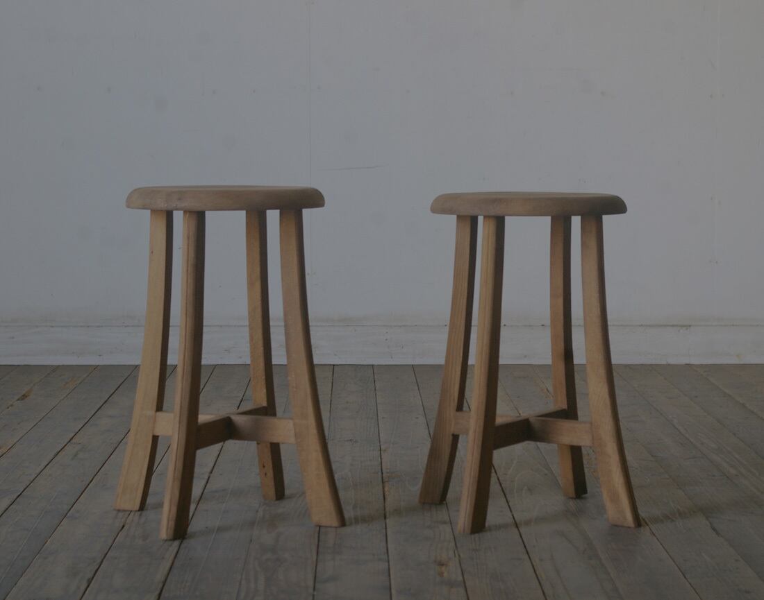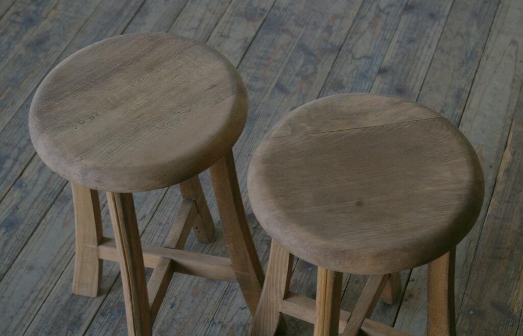 古い無垢材の綺麗な木目がとても雰囲気の良いアンティーク丸スツール2脚セットです。